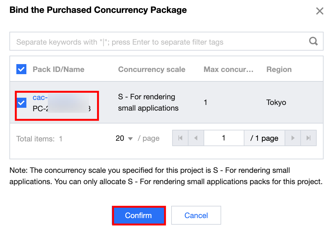 3. Select a specified concurrency package as instructed in the pop-up window of binding a purchased concurrency package. Then, click Confirm to complete the concurrency package binding configuration, as shown below: