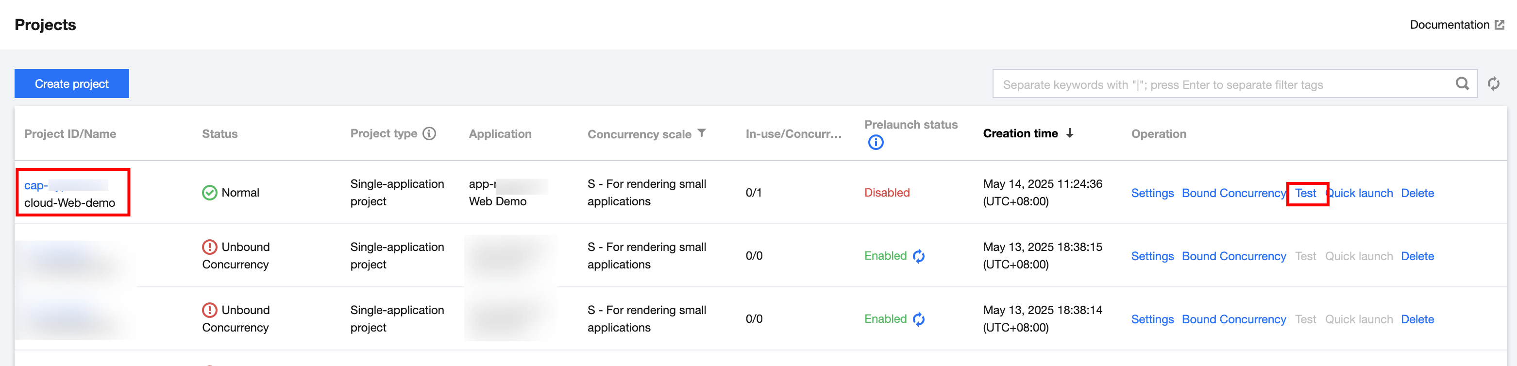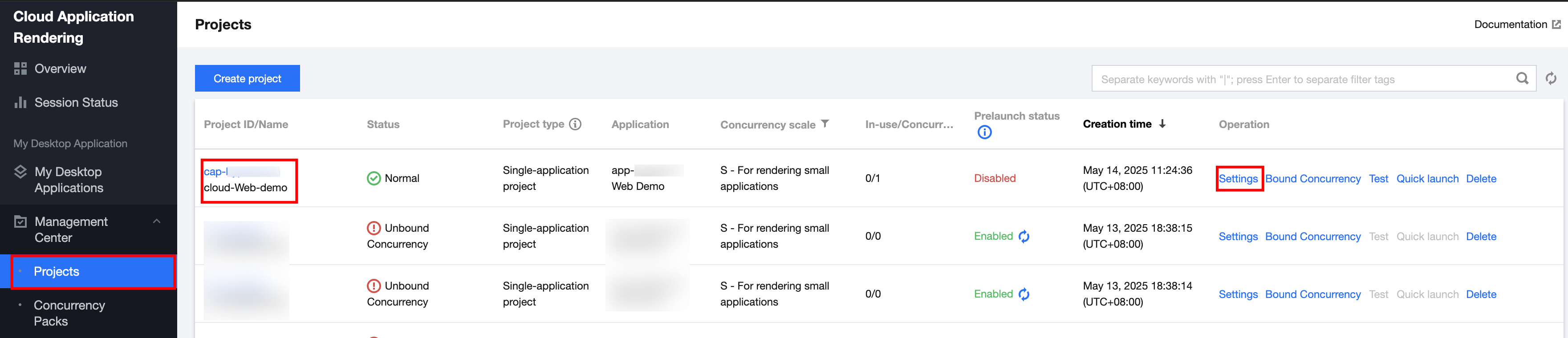 1. In the process of creating a CloudApp project in step 2 mentioned above, we set the web address. You can complete and modify it on the project management page. In the console, click the Projects interface to perform project settings, and then click Settings at the operation section. As shown below: