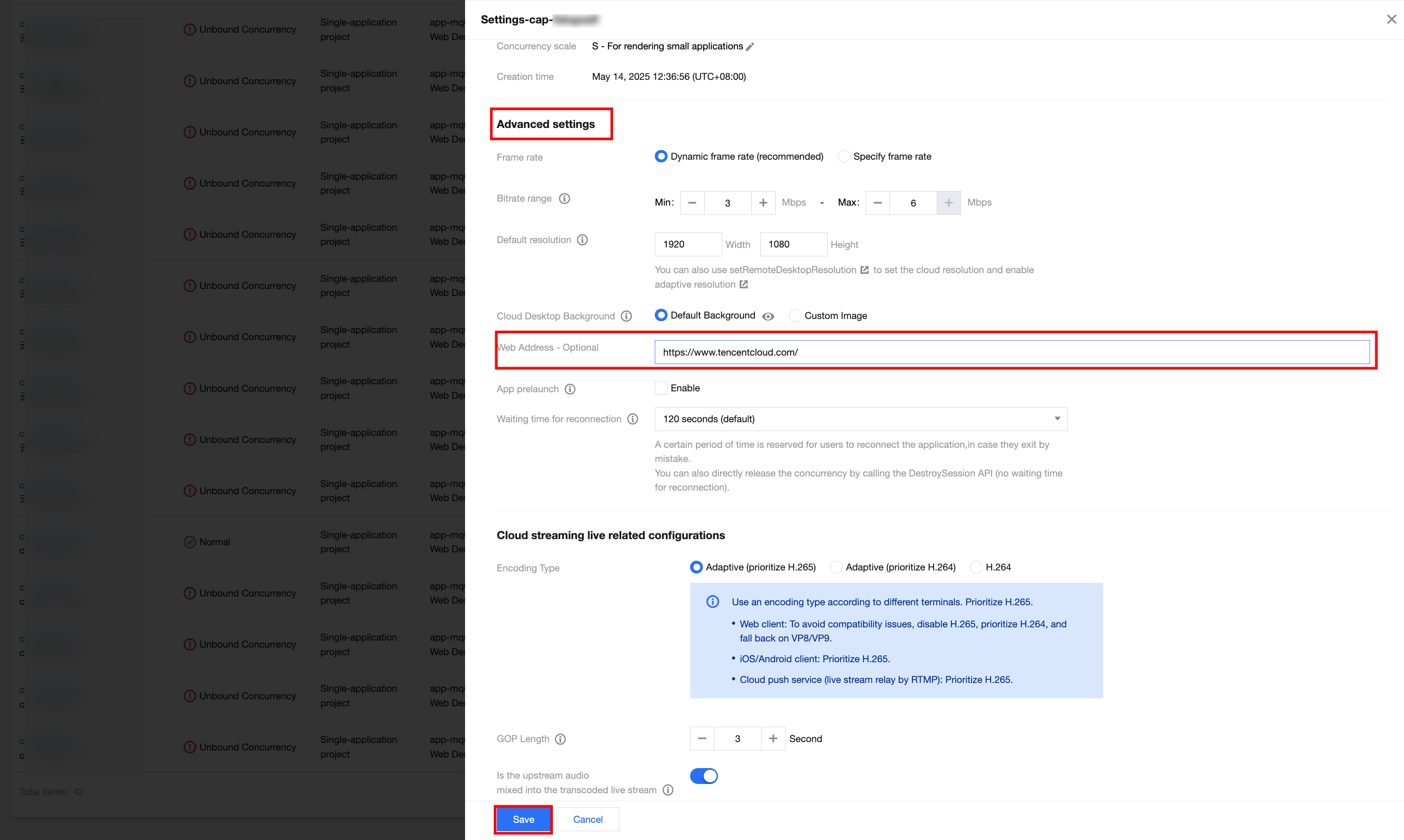 2. Enter or modify the web address you want to open in the advanced settings area on the project configuration page. This document takes the Tencent Cloud address (https://tencentcloud.com/) as an example. After the web address is entered, click Save, as shown below: