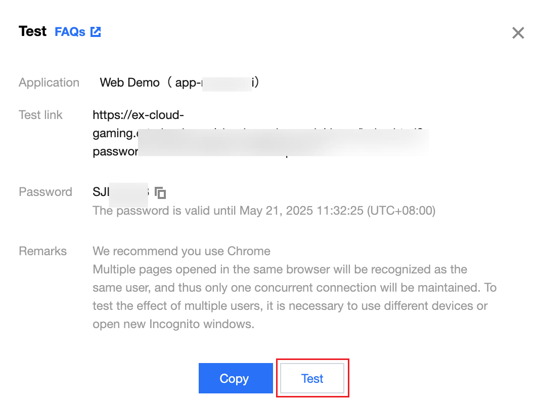 4. In the pop-up effect testing page, click Test. As shown below: