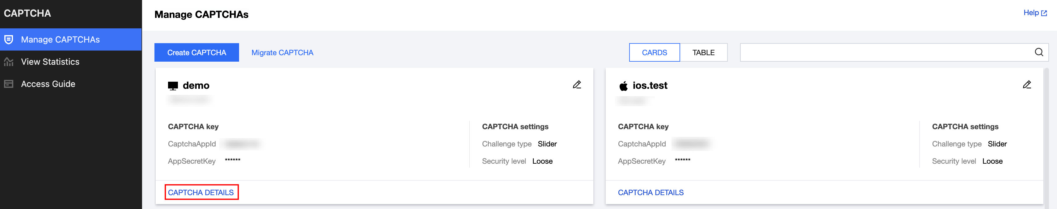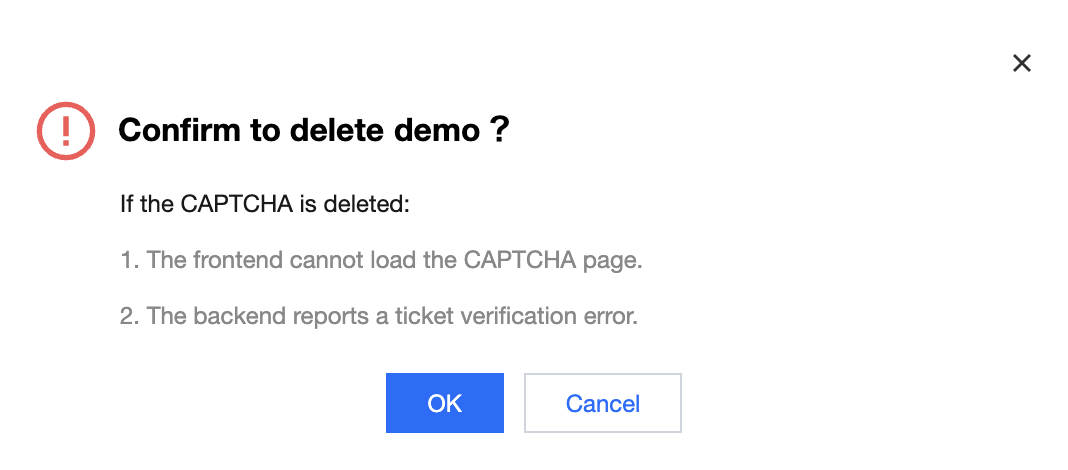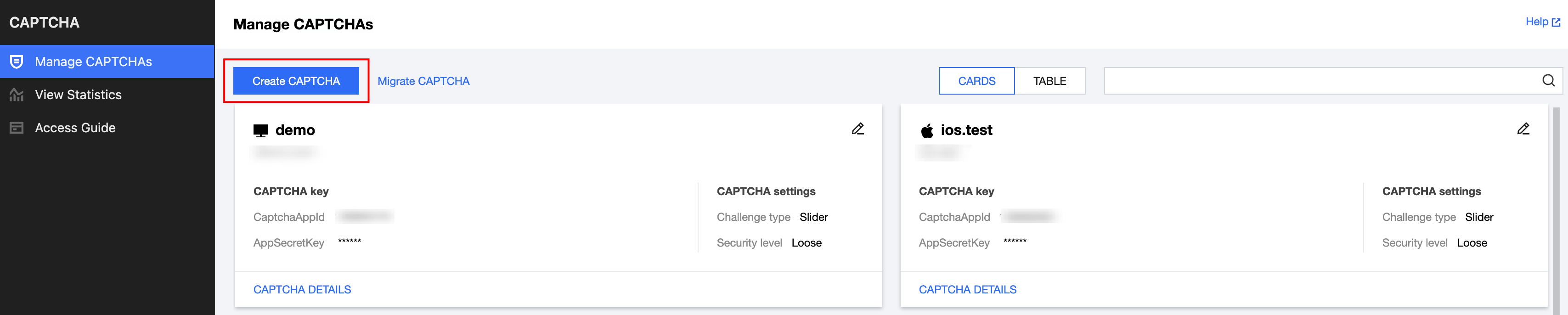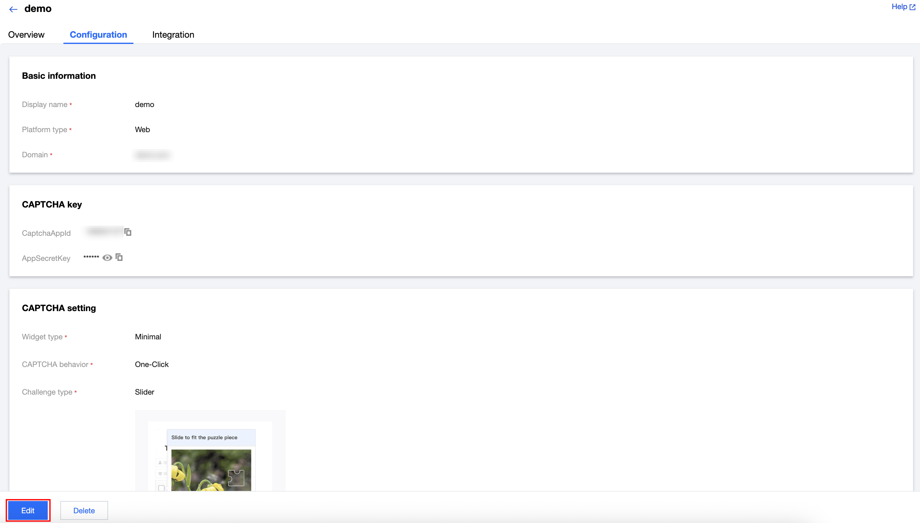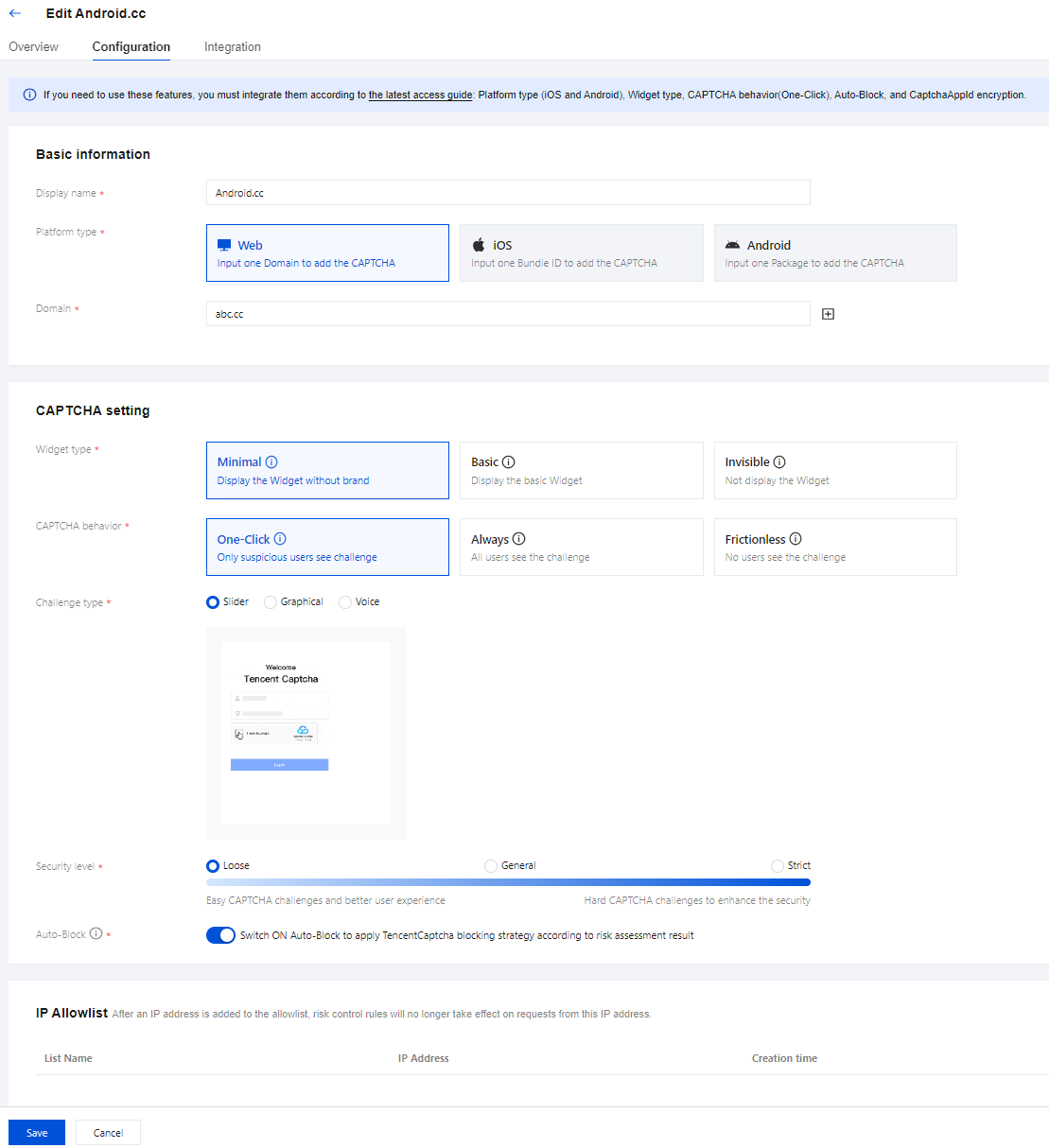 Platform type | Set the platform type for integrating the CAPTCHA. Supports Web, iOS, and Android. Web: Select Web, then configure Domain to add the CAPTCHA. iOS: Select iOS, then configure Bundle ID to add the CAPTCHA. Android: Select Android, then configure Package name to add the CAPTCHA. |