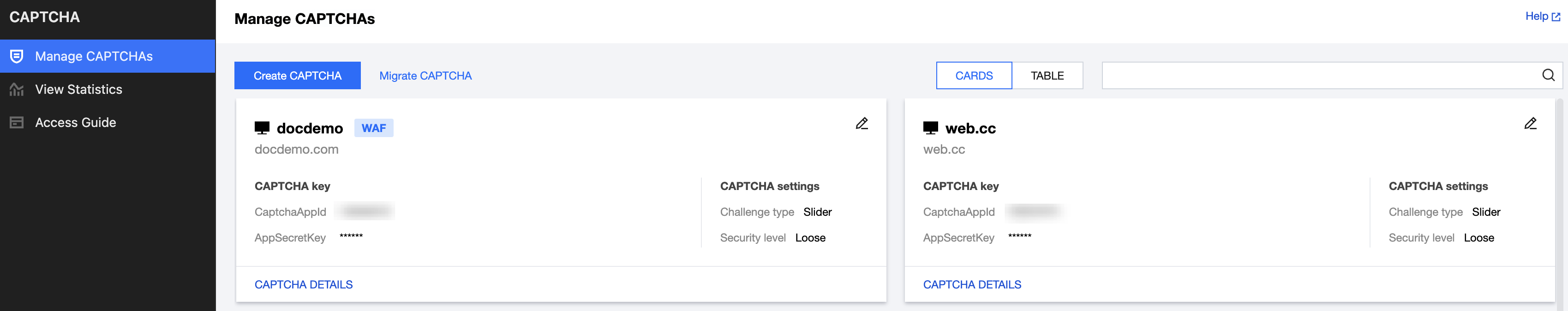 WAF Service | Select whether to integrate the WAF service. After enabling the WAF service, users who use both CAPTCHA and WAF services can apply the CAPTCHA results to WAF security policies. For detailed instructions, please refer to Integration with WAF. Notes: This option cannot be modified once saved. |