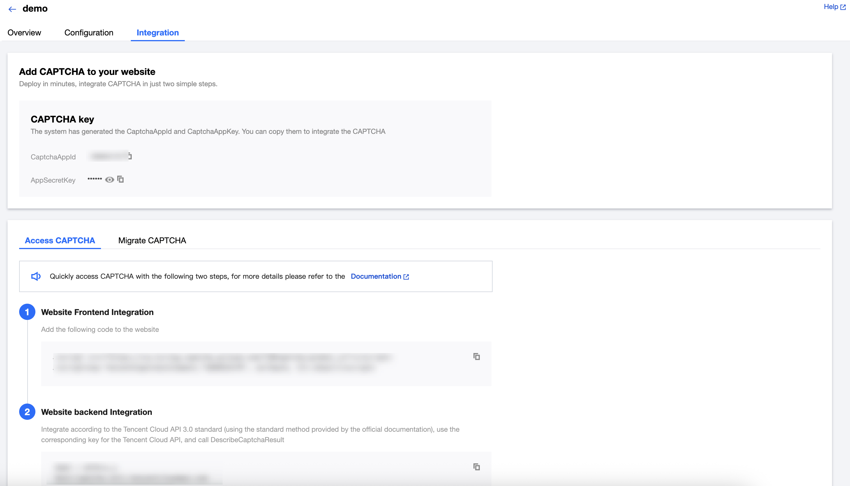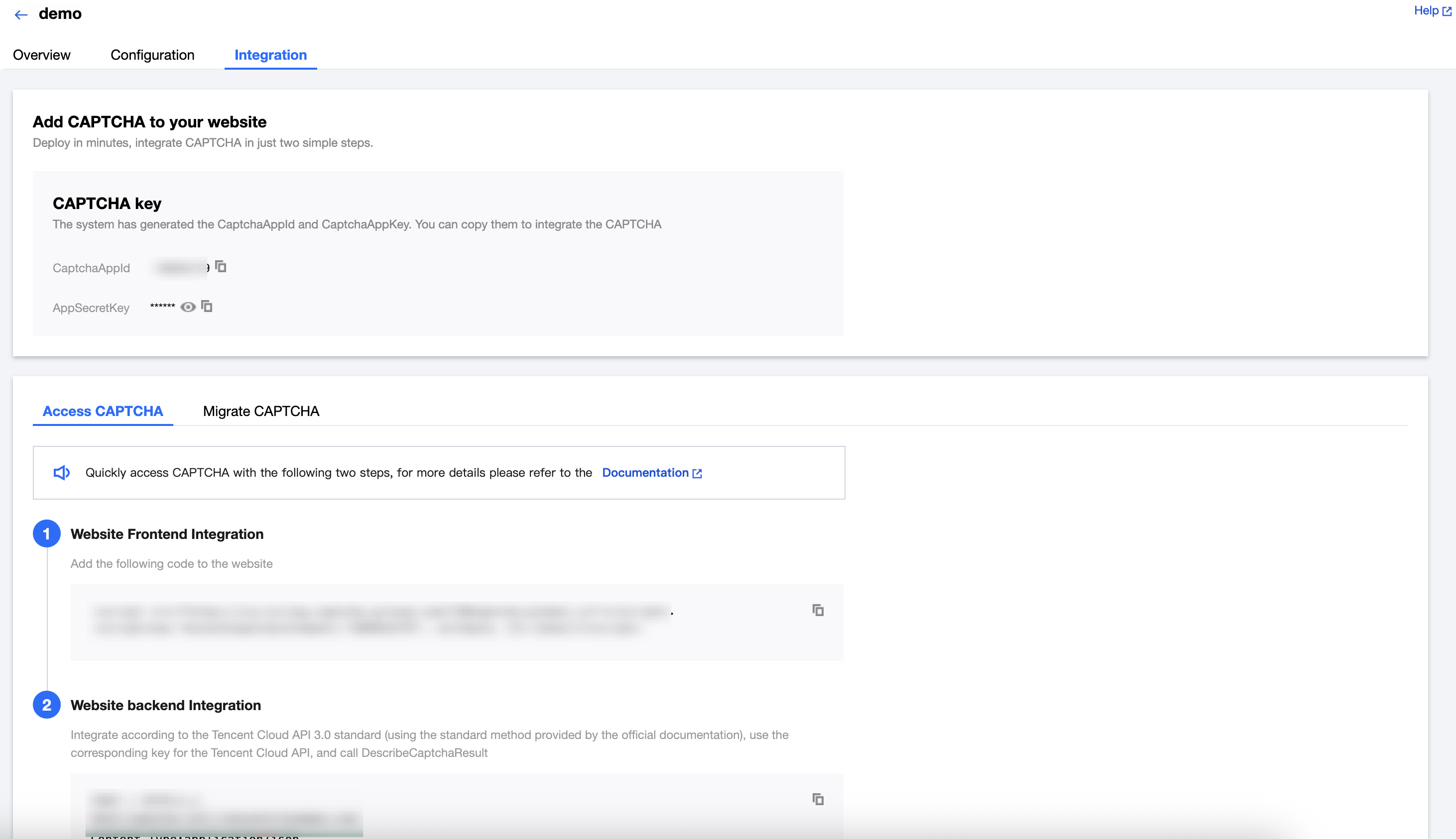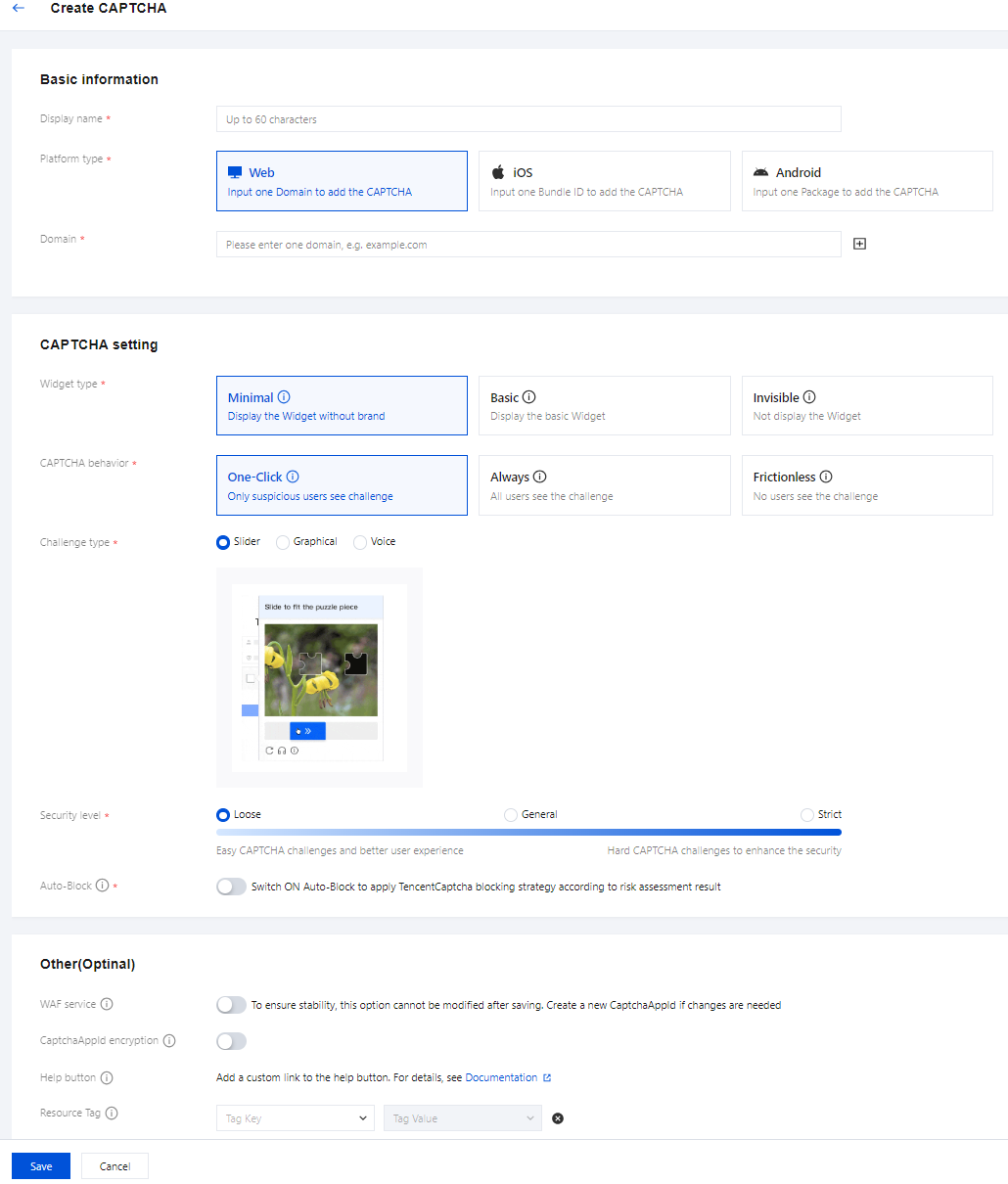 CAPTCHA setting | CAPTCHA settings include Widget type, CAPTCHA behavior, Challenge type, and Security level. Widget type: Supports Minimal, Basic and Invisible. Minimal: Display the widget without brand. Basic: Display the basic widget. Invisible: Not display the widget. CAPTCHA behavior: Supports One-Click, Always and Frictionless. One-Click: Only suspicious users see challenge. Always: All users see the challenge. Frictionless: No users see the challenge. Challenge type: Supports Slider, Graphical and Voice. Slider: Drag the slider to complete the puzzle. Graphical: Click the correct graphics in order according to the prompt. Voice: Enter the CAPTCHA as prompted by the voice message. Security level: Supports Loose, General and Strict. Loose has the lowest interception level, while Strict has the highest. Auto-Block: When enabled, TencentCaptcha decides whether to block risky requests and require retry. Default OFF allows your site to take action in case of risk detected by TencentCaptcha. Notes: Invisible verification mechanism does not support managed interception policy settings. |