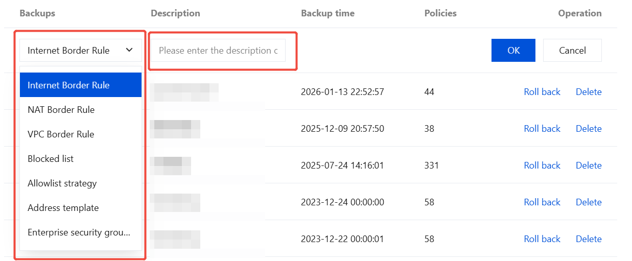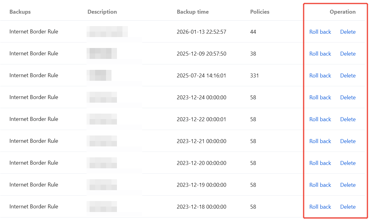 Roll back: Click Roll back in the Operation column of the target backup rule. In the "Confirm to roll back with the backup" pop-up window, click OK to roll back the backed-up rules and overwrite the current rule list.