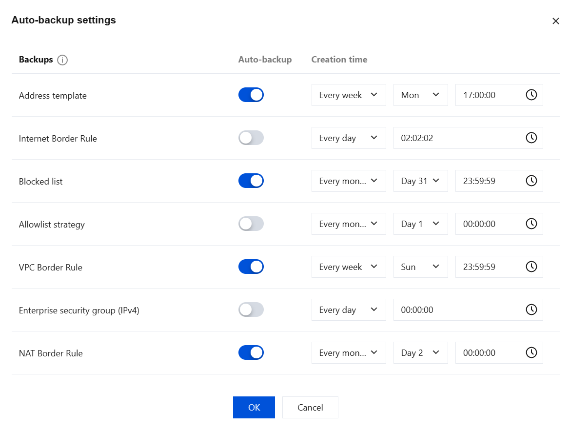 Creation time | Set the execution cycle and specific time for automatic backups. The following three cycle types are supported: Every day: Select the specific time to perform daily backups. Every week: Select a specific day from Monday to Sunday and set the backup execution time. Every month: Select a specific day from the 1st to the 31st and set the backup execution time. Note: When monthly backup is selected, if the chosen date exceeds the actual number of days in that month (for example, selecting the 31st when there are only 30 days), the backup will be performed on the last day of that month. |