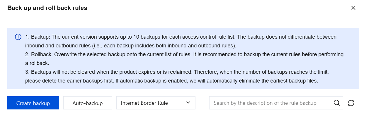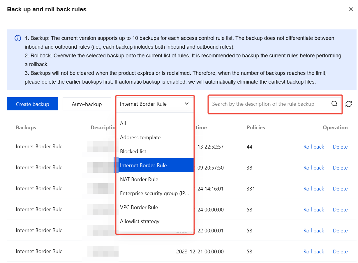 3. In the policy backup and rollback dialog, select the rule list to be managed, or enter a description in the search box on the right to search.