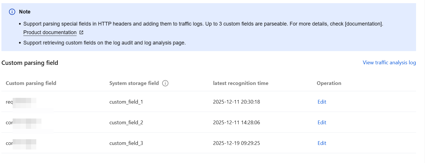 2. In the custom parsing field list, select the field to be edited and click Edit to parse special fields in HTTP Headers and add them to traffic logs. Currently, up to 3 custom fields can be parsed.