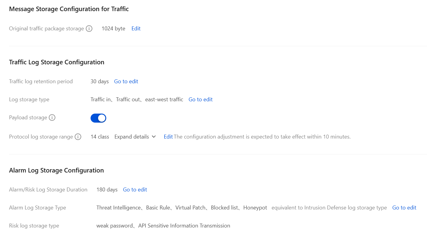 On the Network Detection and Response page, click Network Detction and Response Settings in the upper-right corner, go to Storage Settings to Message Storage Configuration for Traffic, Traffic Log Storage Configuration, and Alarm Log Storage Configuration.