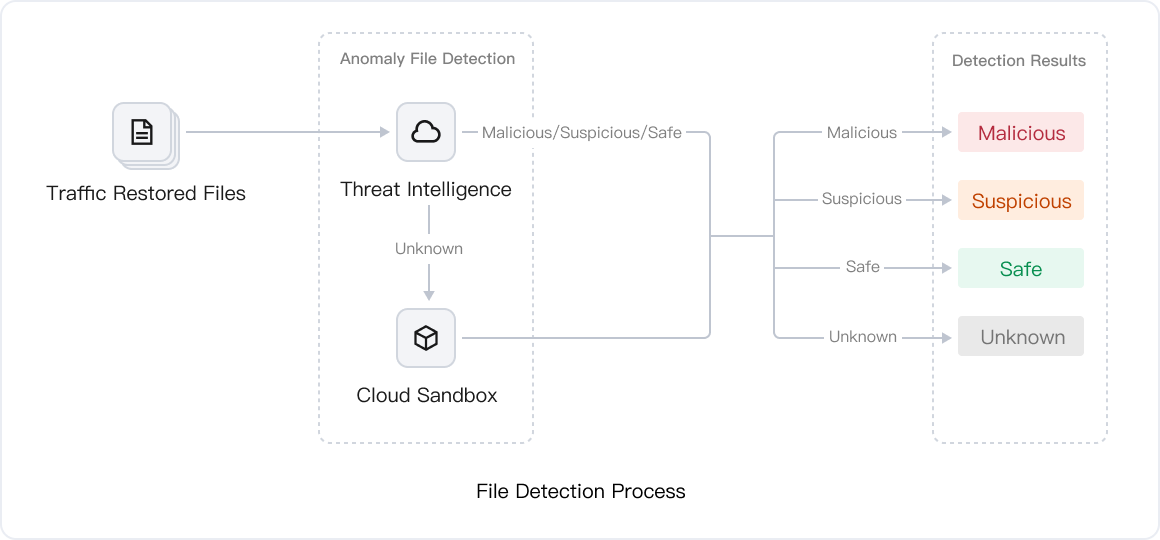 Detection of abnormal file transfers: When it is enabled, it restores files transmitted in network traffic and leverages the Threat Intelligence cloud-based query scanning engine to accurately identify malicious files.