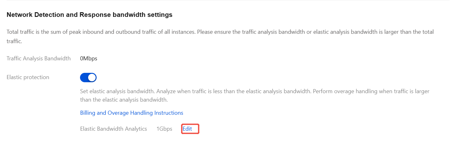 Elastic Protection: Set elastic analysis bandwidth. Analyze when traffic is less than the elastic analysis bandwidth. Perform overage handling when traffic is larger than the elastic analysis bandwidth. For details on billing and excess traffic handling, see Bandwidth Details. You can adjust the elastic analysis bandwidth value as needed. Click Edit to modify, and after completion, click Confirm to Adjust to save the settings. Network Detection and Response overage handling: Exceeding bandwidth for traffic analysis will not cause packet loss or impact traffic rates in customer services, but will disable the Network Detction and Response feature.