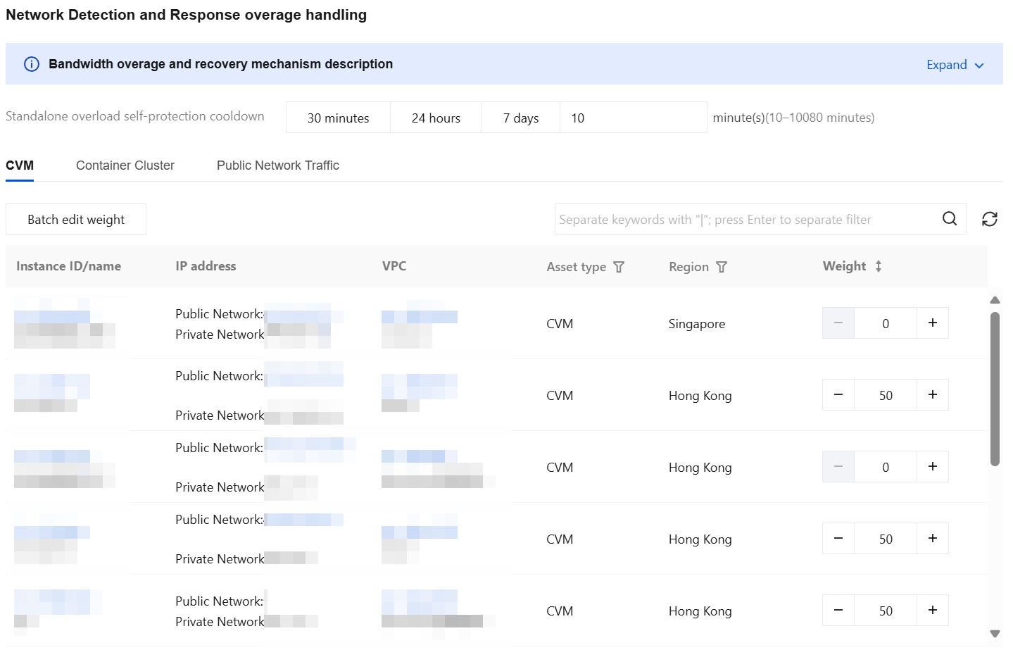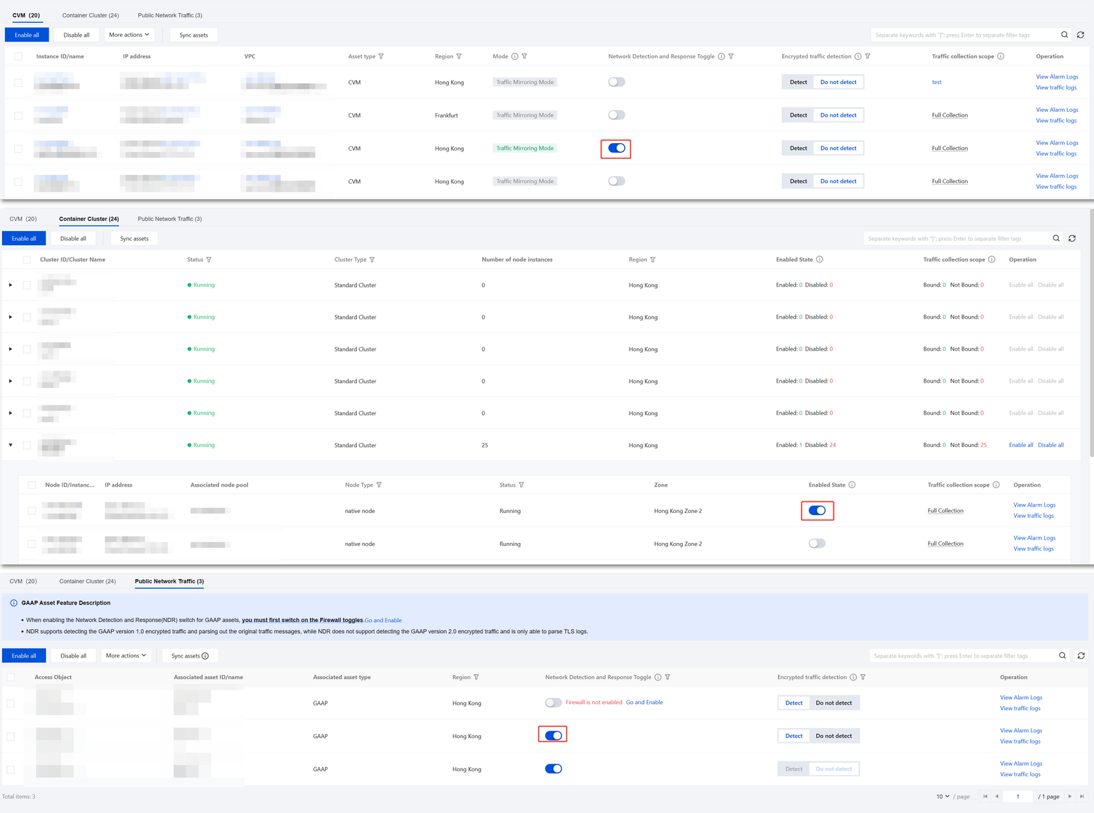 To try out, you can submit a ticket to apply for a trial of the Network Detction and Response feature. 2. On the Network Detection and Response page, container clusters support enabling the Network Detction and Response based on nodes, and CVM supports enabling the Network Detction and Response switch based on assets.