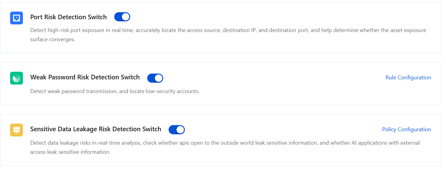 Sensitive Data Leak Risk Detection Switch: Detect data leakage risks in real-time analysis, check whether apis open to the outside world leak sensitive information, and whether AI applications with external access leak sensitive information. Click Policy Configuration to enable or disable specific detection policies.