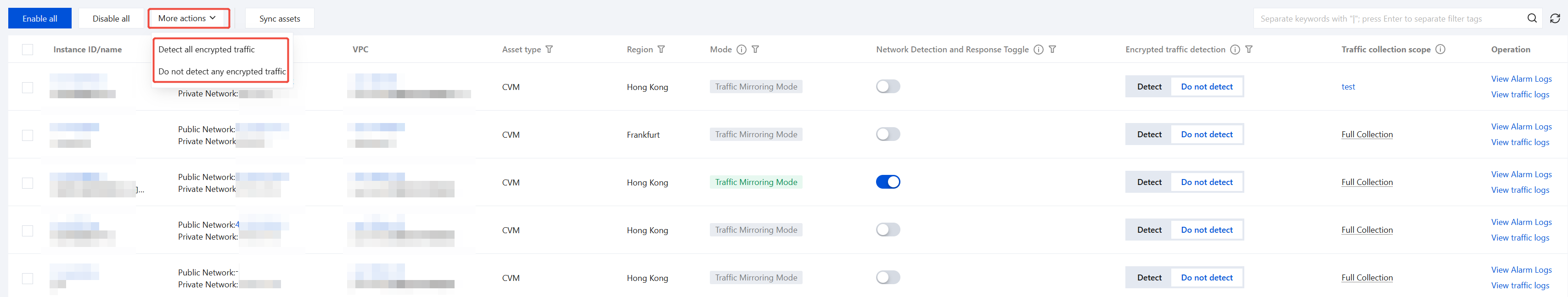 1. If you need to uniformly configure the status of encrypted traffic detection for all CVM assets, you can quickly do so via More Actions: