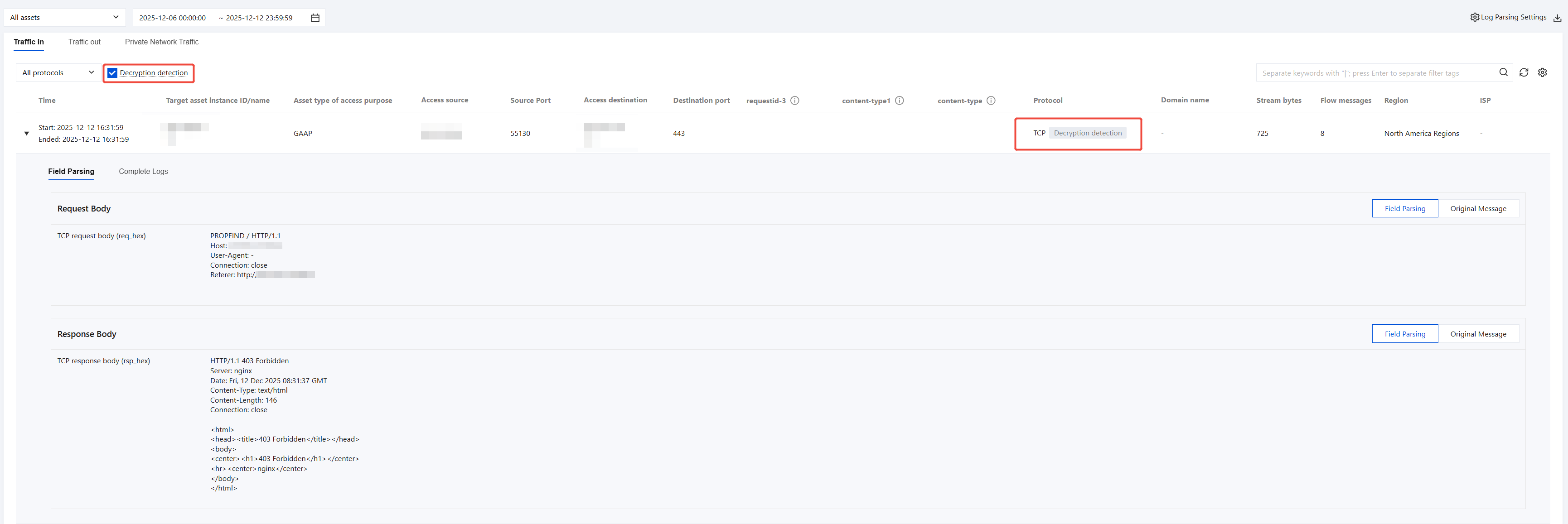 On the Log Auditing > Network Detection and Response Logs > Traffic Analysis Logs or Traffic Alarm Logs page, for traffic logs of encrypted protocols such as HTTPS, SMTPS, FTPS, the system will first restore the plaintext content (such as request headers, response bodies, and so on) and label it with Decryption Detection beside it; you can also select the Decryption Detection option to quickly filter and view all logs related to encrypted traffic detection.