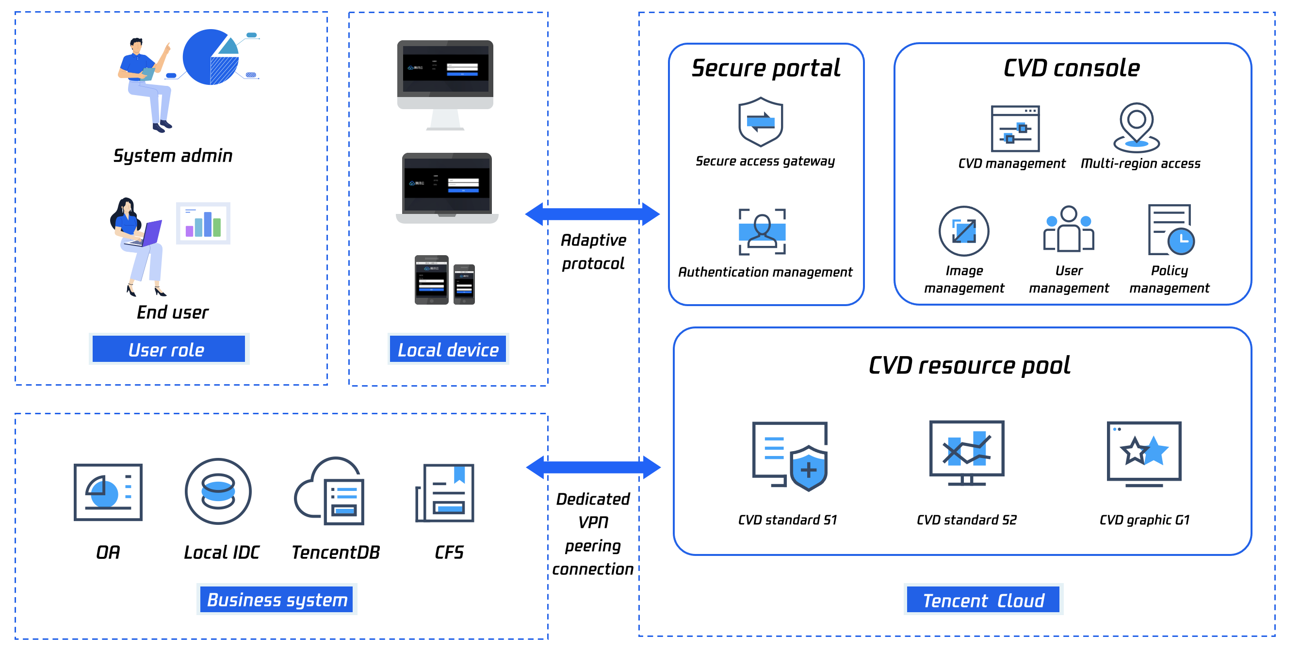 Cloud Virtual Desktop (CVD) offers virtual desktop services featuring on-demand and quick delivery. It uses an encrypted adaptive transmission protocol to build a secure portal for business access and ensure a high-quality CVD access experience for end users. CVD helps create reliable digital workspaces to achieve remote work and enhance the security and continuity of business access.
