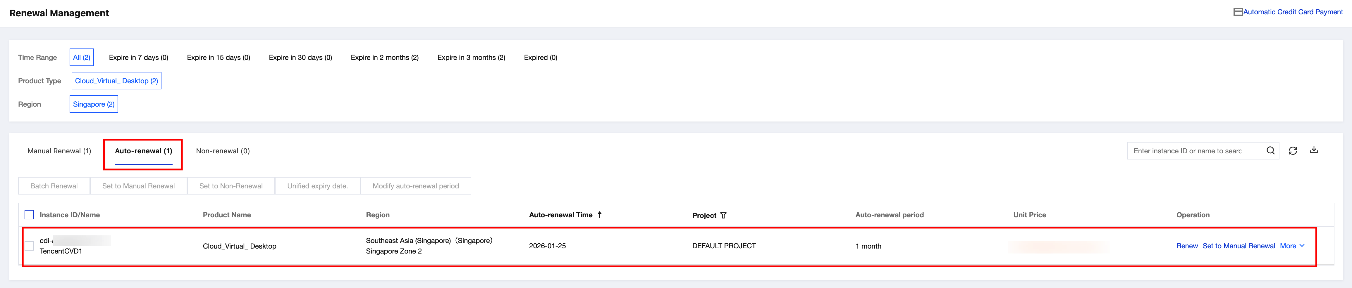 To view the instance subscribed for auto-renewal on the Renewal Management page of the Billing Center console, perform the following steps: