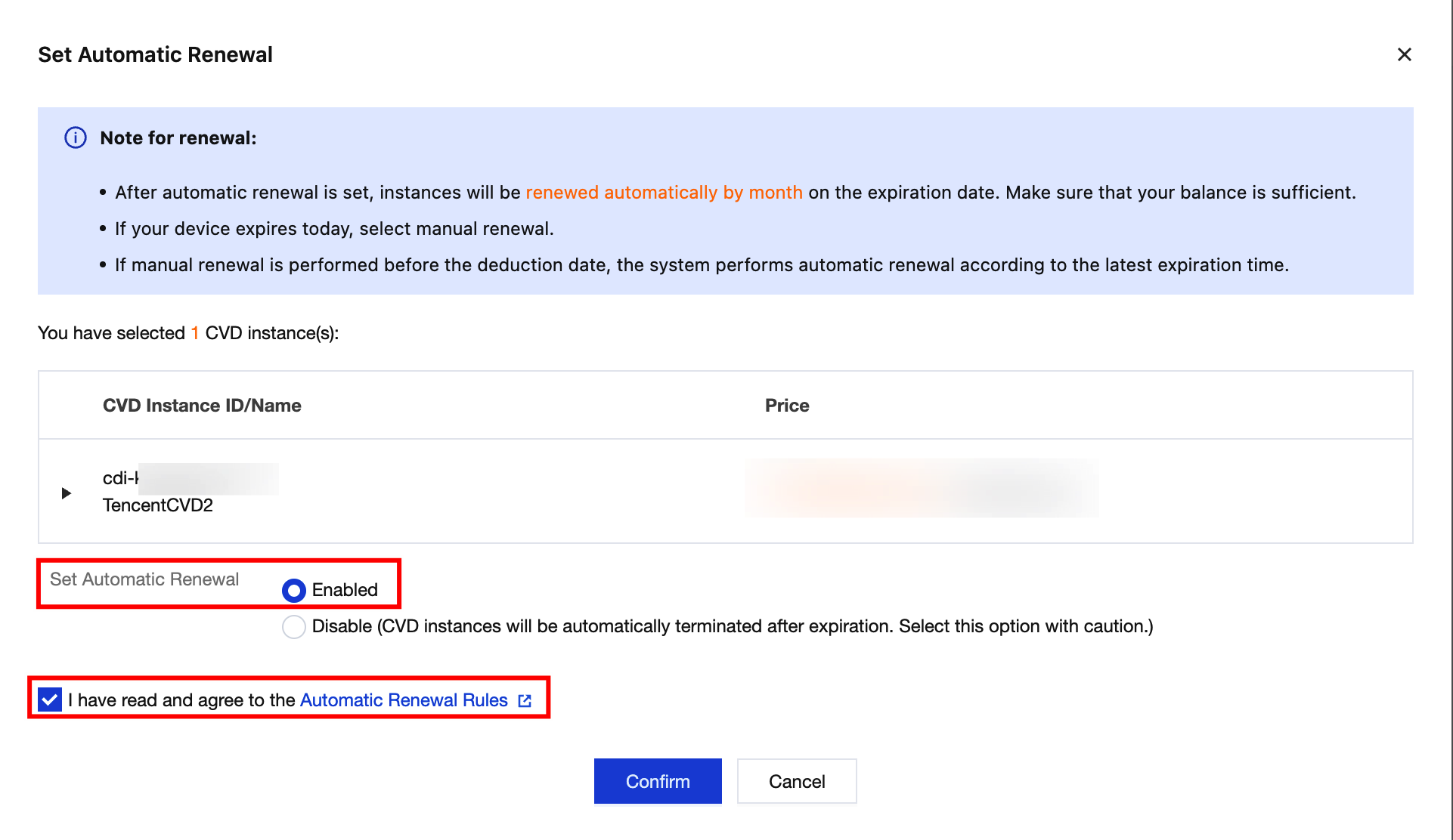 3. In the Set Auto-Renewal pop-up window, confirm the CVD instance information. If correct, select the checkbox to agree to the Auto-Renewal Rules and select Enable for the auto-renewal setting.