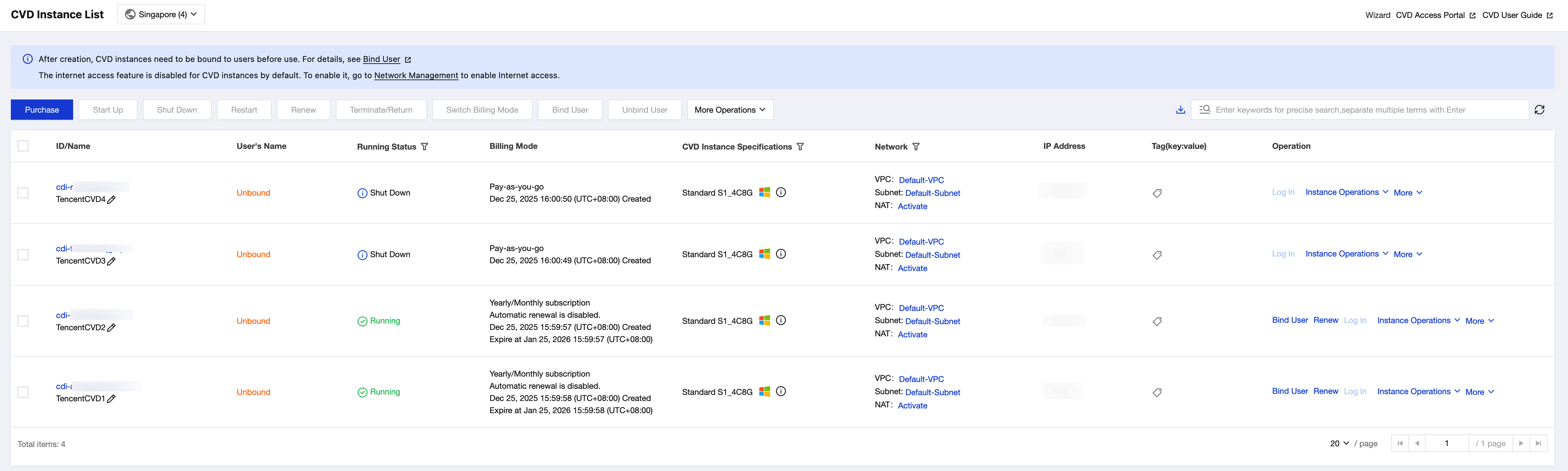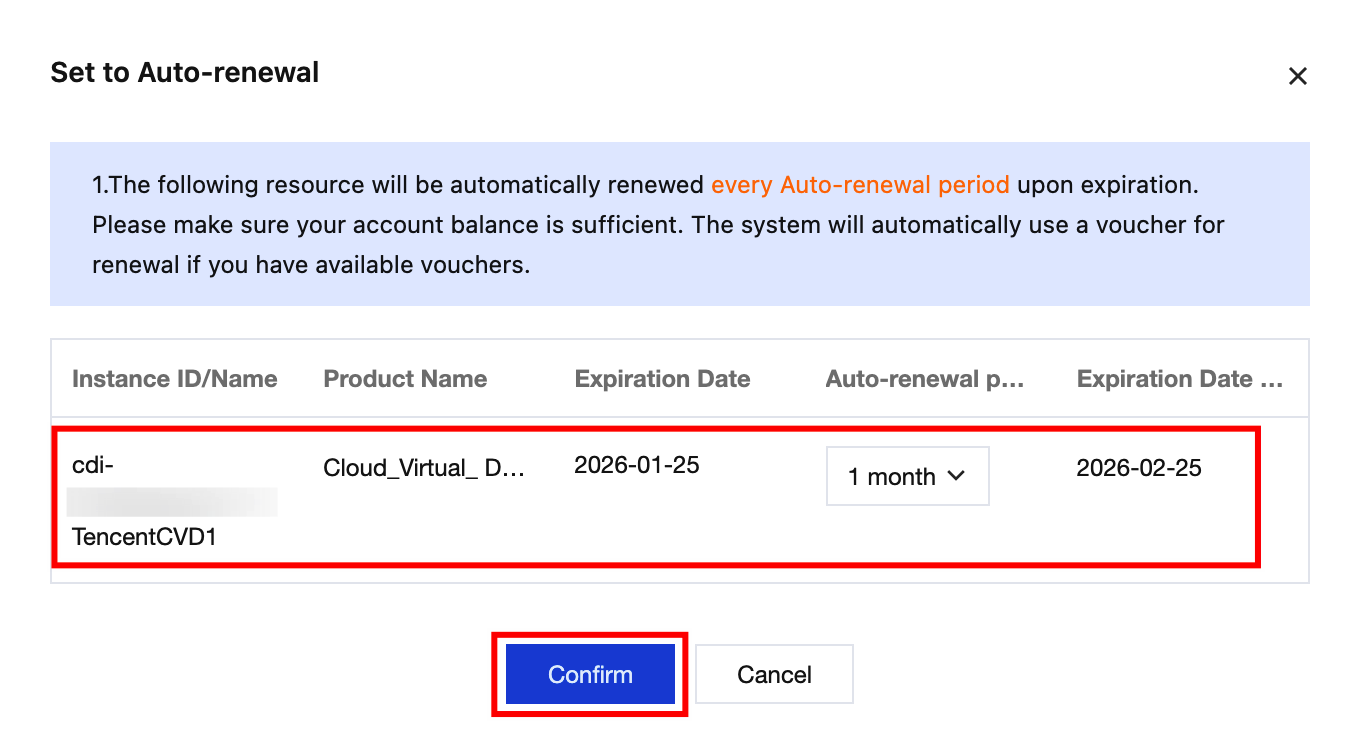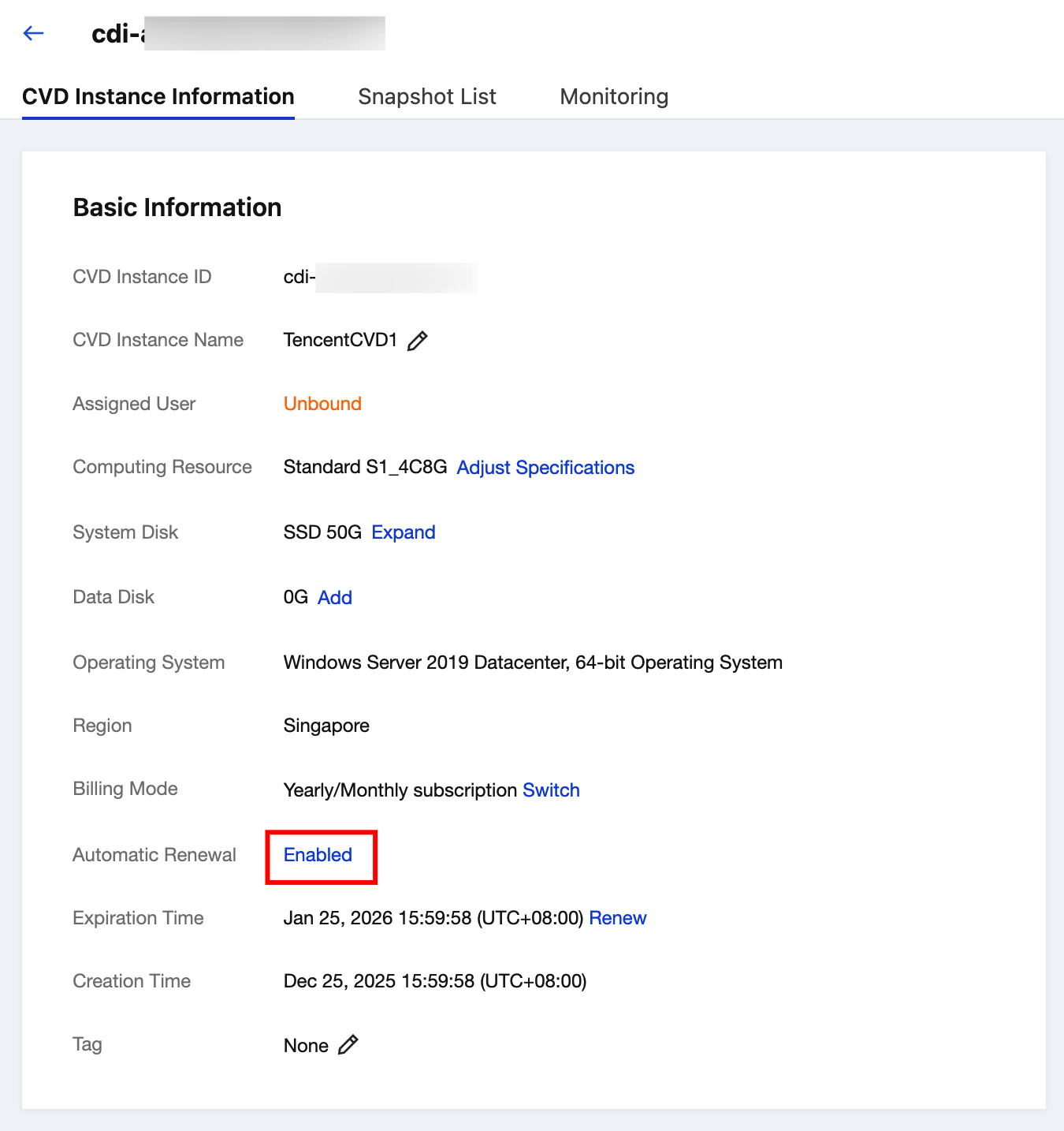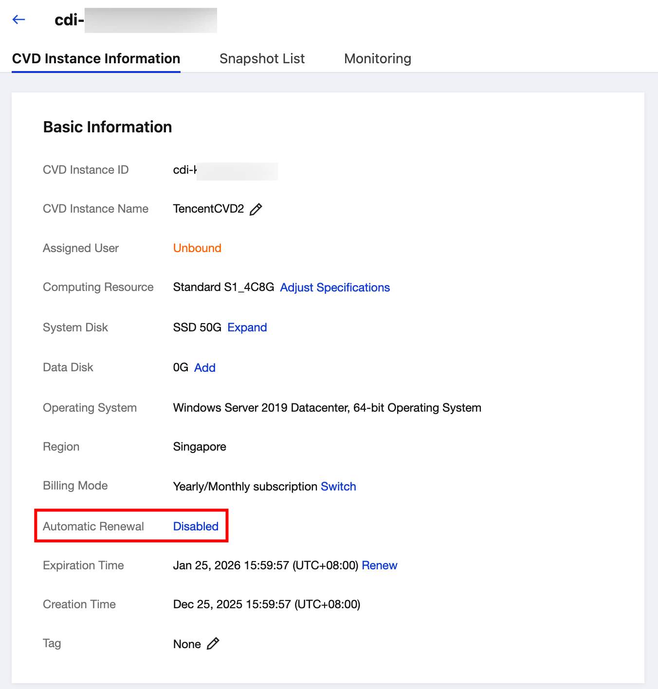 2. Find the CVD instance whose auto-renewal status you want to check and view the related auto-renewal information on the instance details page.