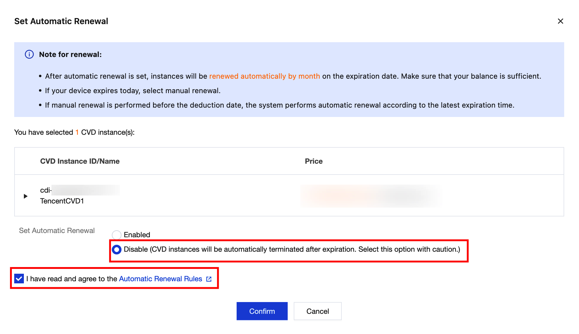 3. In the Set Auto-Renewal pop-up window, confirm the product information. If correct, select the checkbox to agree to the Auto-Renewal Rules and select Disable for the auto-renewal setting.