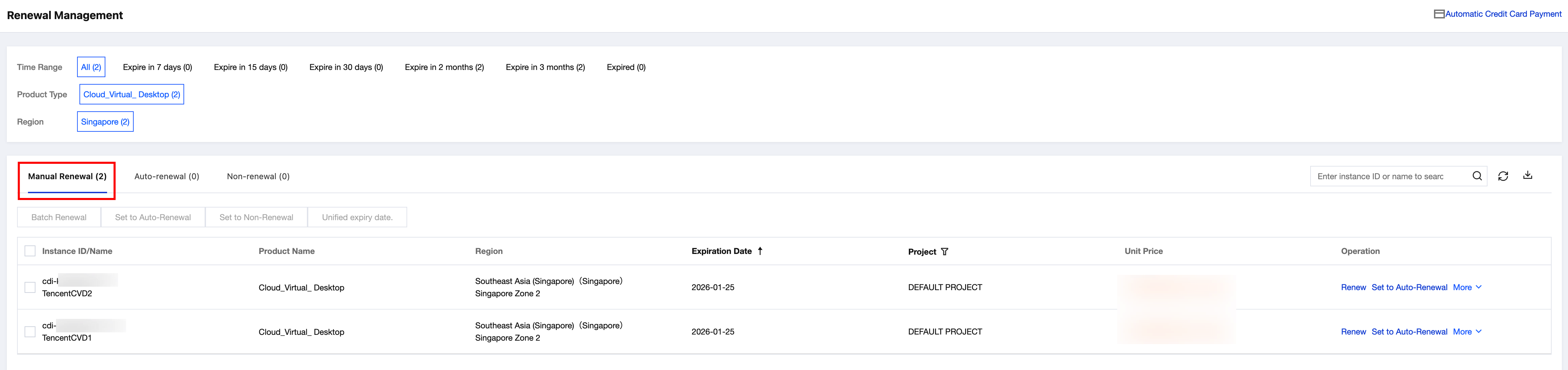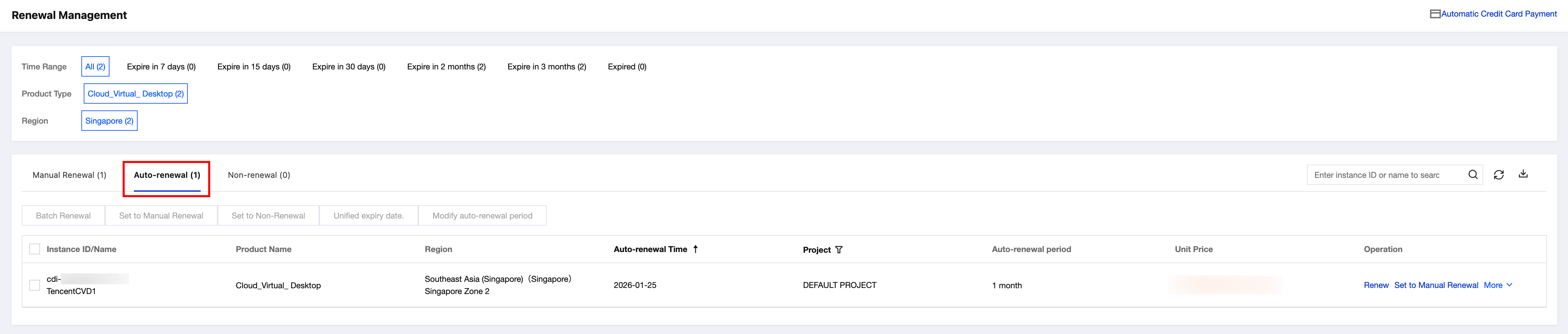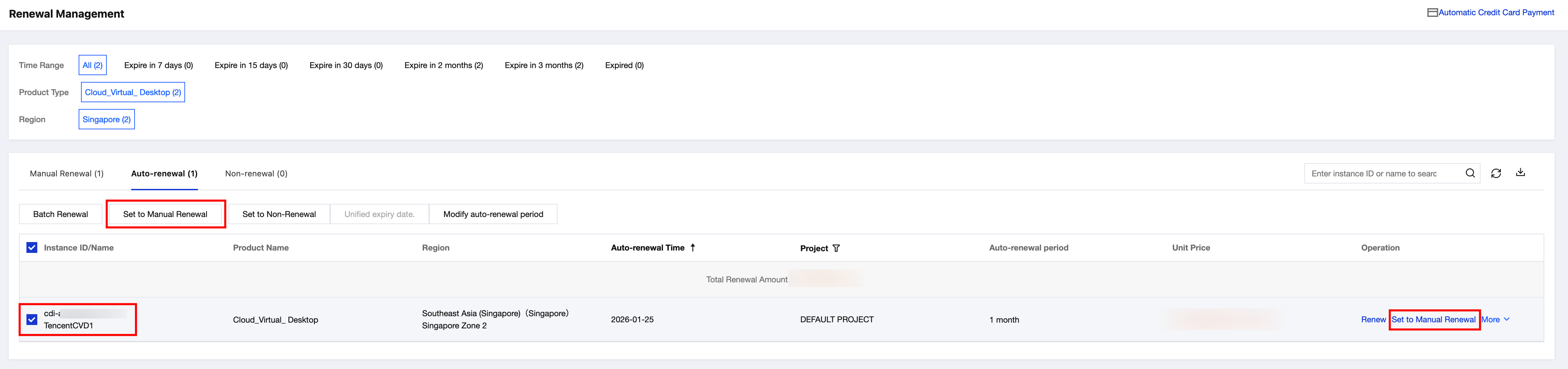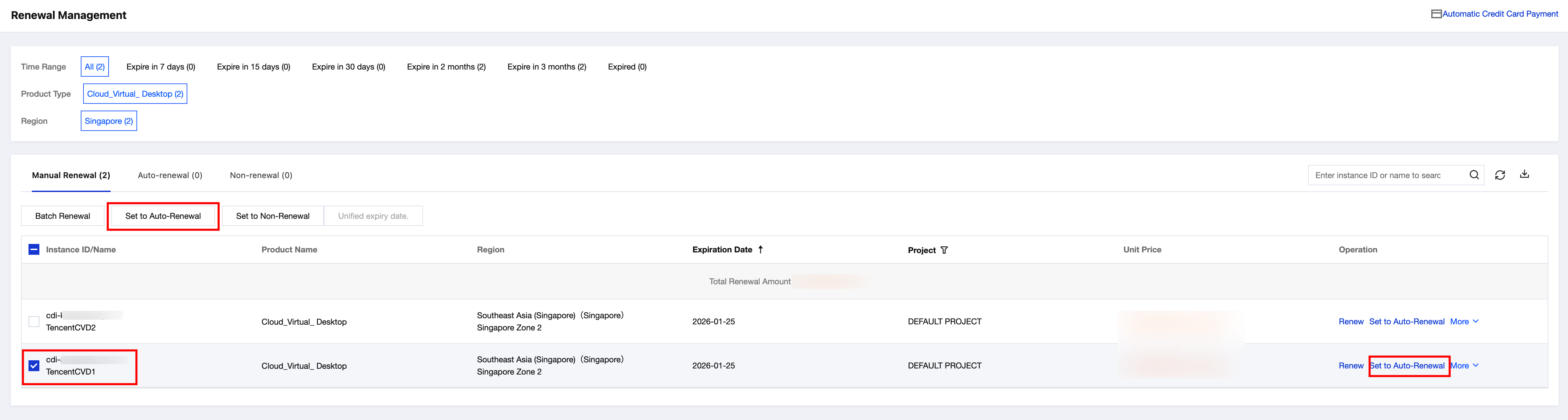 To enable auto-renewal on the Renewal Management page of the Billing Center console, perform the following steps: