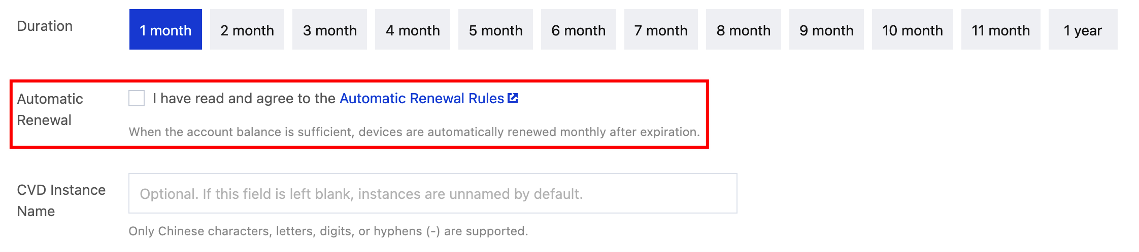 You can select the option to enable auto-renewal when purchasing instances on the CVD purchase page.