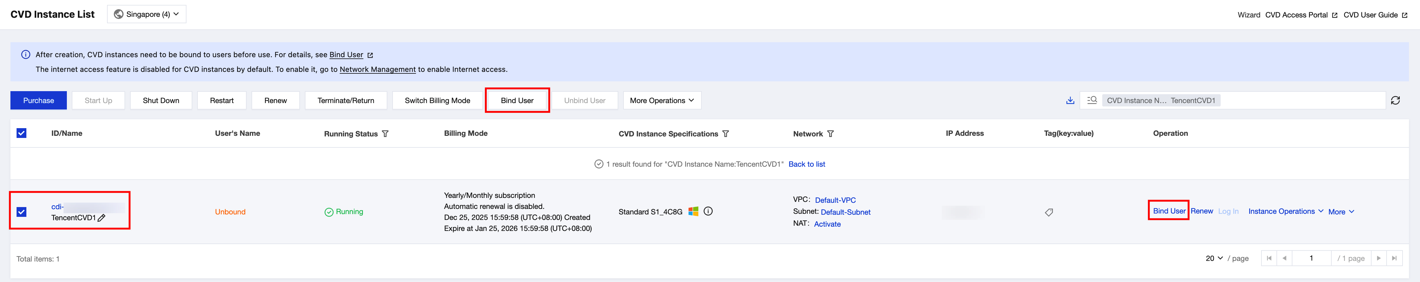 2. On the CVD Instance List page, select a CVD instance that is not bound to any user, and click Bind User in the operation bar at the top or the operation column on the right.