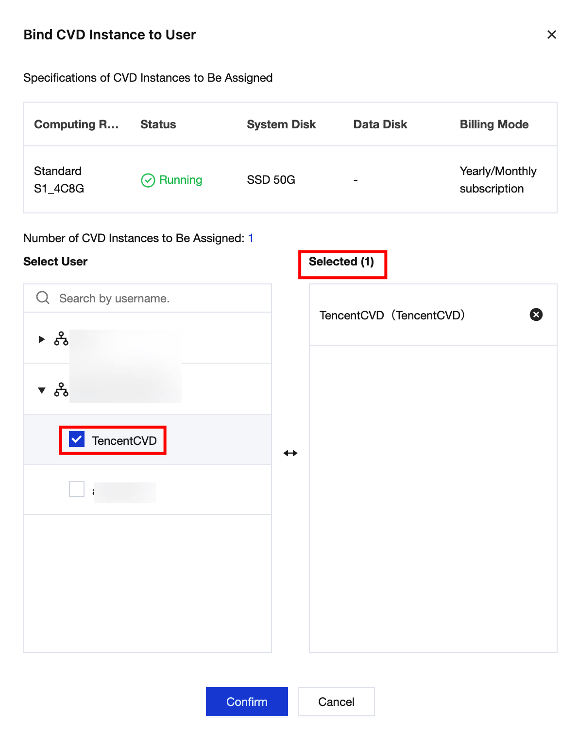3. On the left of the Bind CVD Instance to User page, select users based on the department structure, and click Confirm to complete the binding.