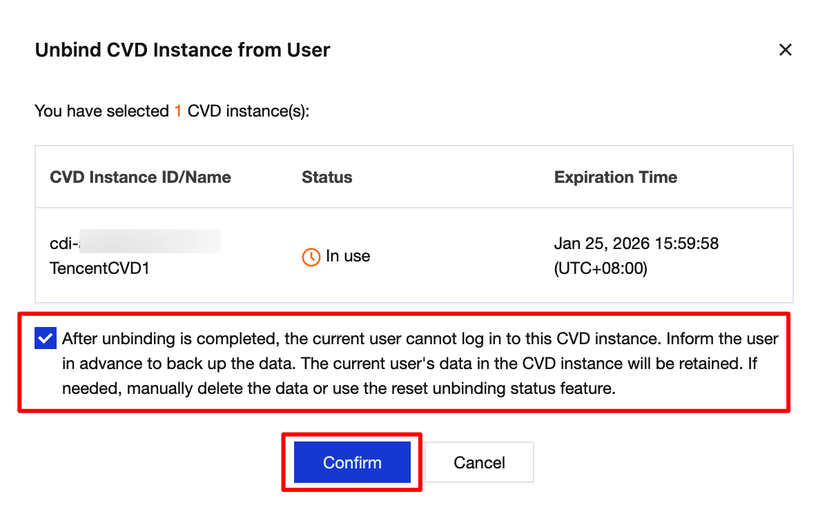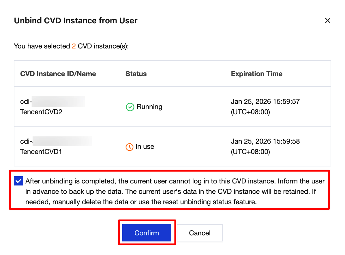 3. In the Unbind User pop-up window, confirm the CVD instances and users to be unbound, read and check the prompt for risk warning, and then click Confirm to unbind the users.