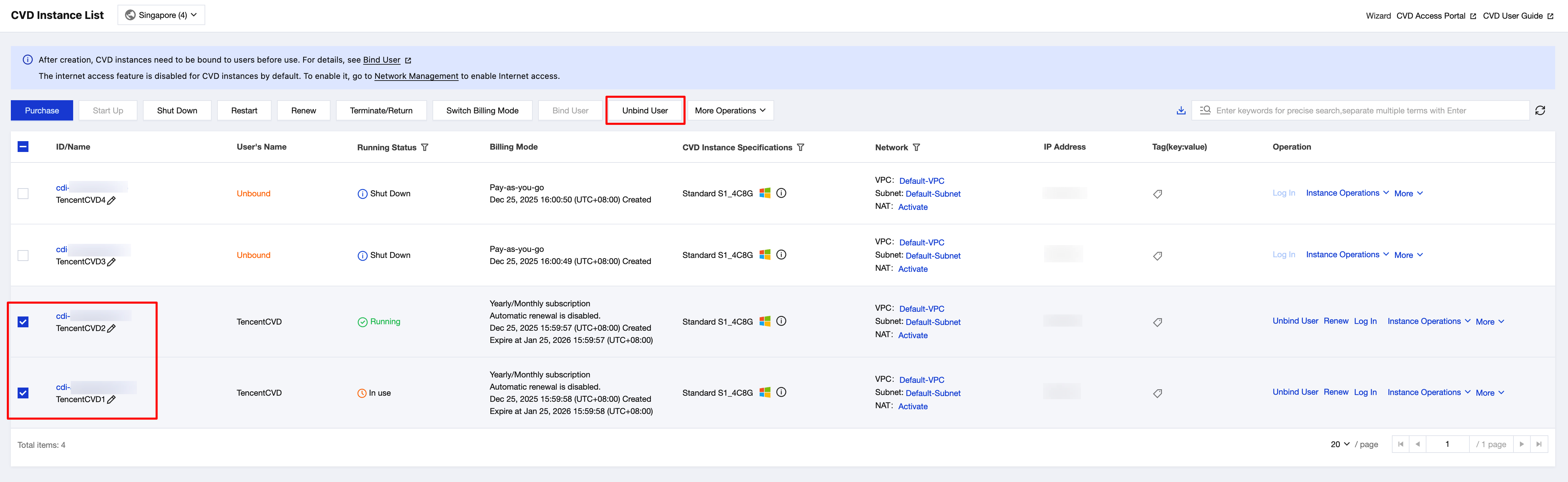 2. On the CVD Instance List page, select the CVD instances that you want to unbind, and click Unbind User in the operation bar at the top.