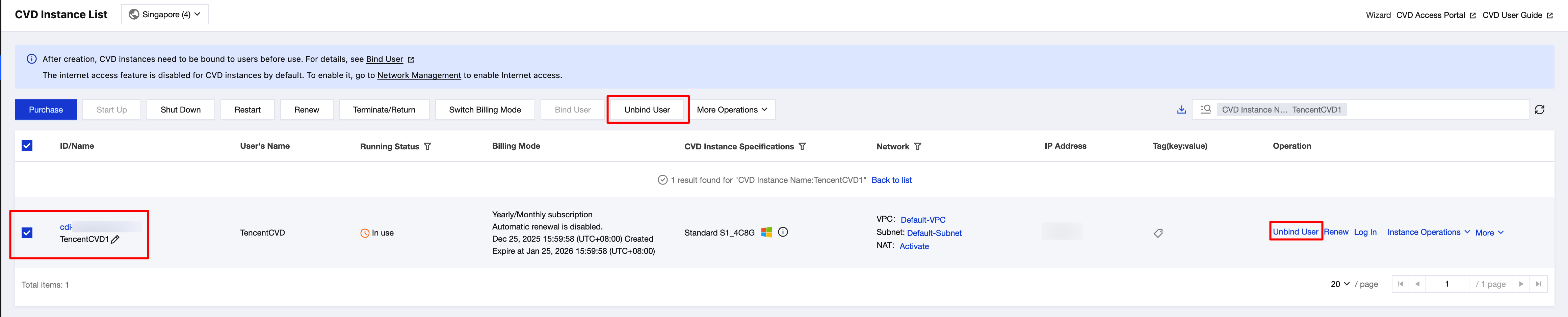 If the current operation status of the CVD instance is In Use, after the user is unbound, the CVD session that the current user is connected to will be logged out. Inform the user in advance to back up data.