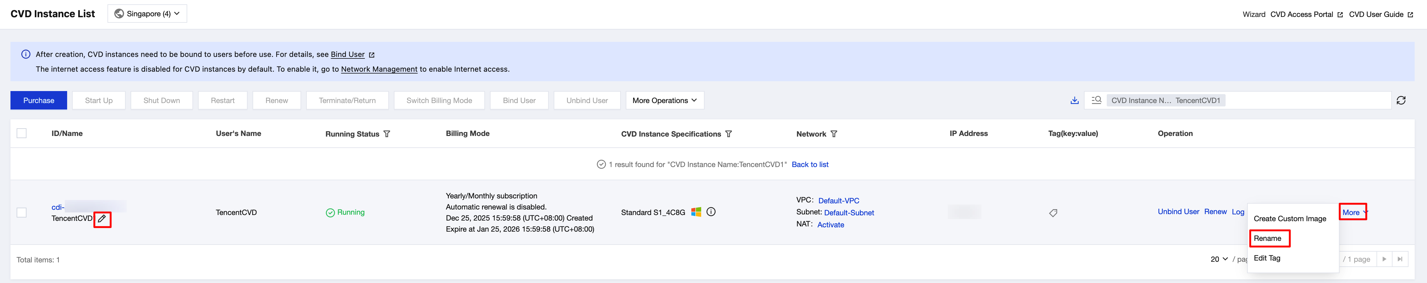 2. On the CVD Instance List page, select the CVD instance that you want to rename, and choose More > Rename in the operation column.