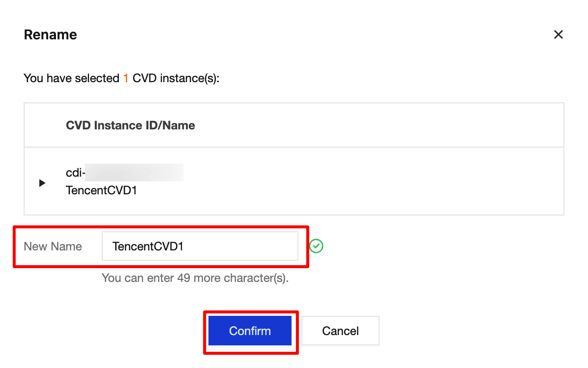 3. On the Rename page, enter the new CVD instance name and click Confirm to complete the renaming.