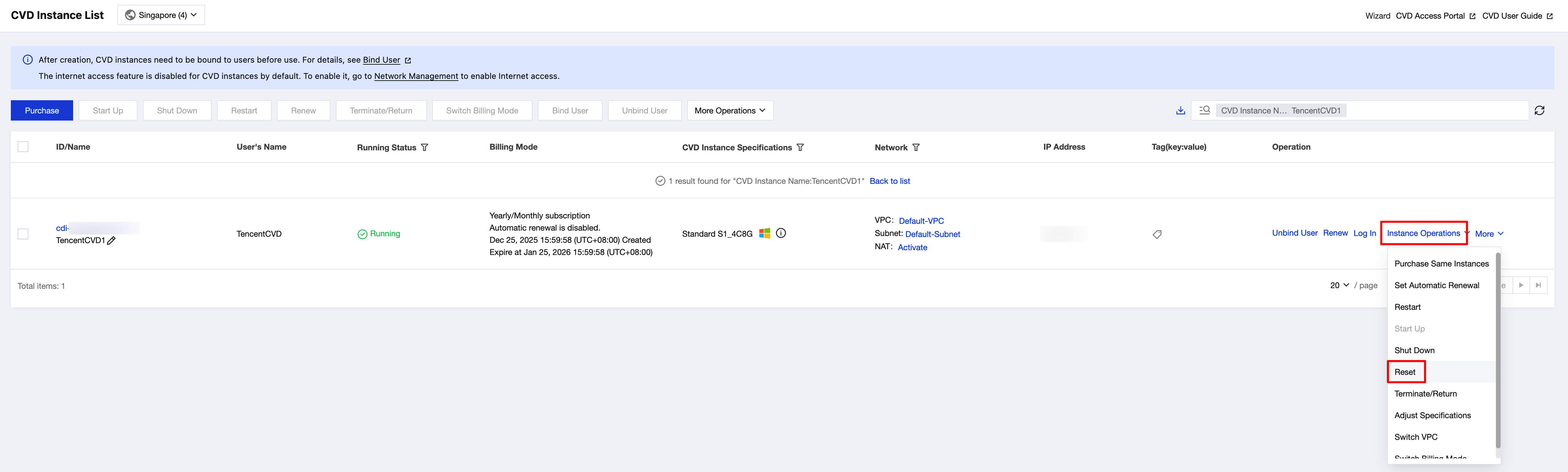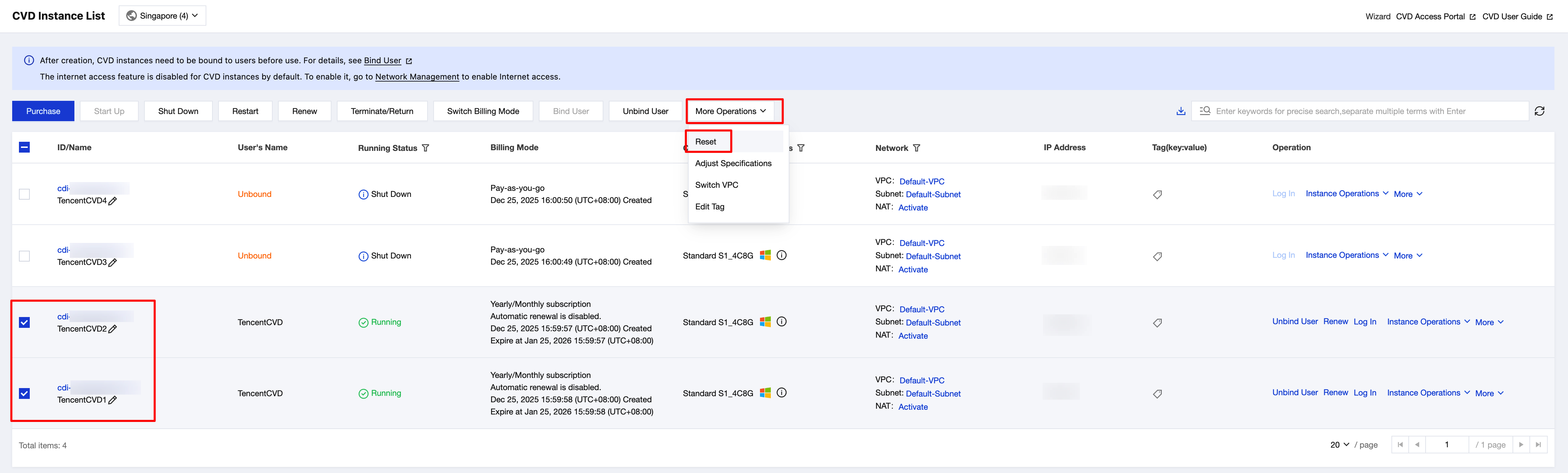 2. On the CVD Instance List page, select the CVD instance that you want to reset, and then click More Operations > Reset in the operation bar at the top or choose Instance Operations > Reset in the operation column on the right.