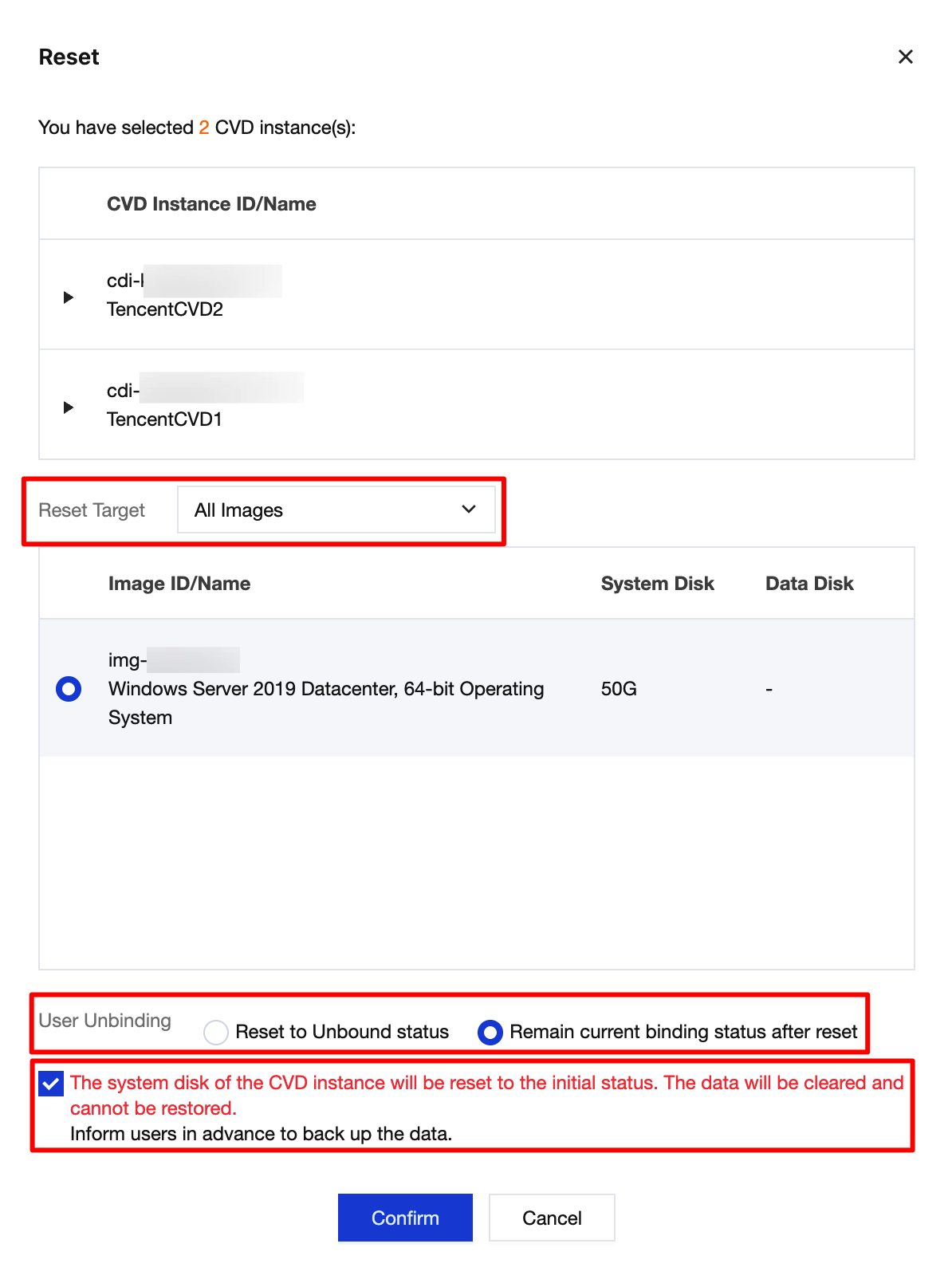 When resetting a CVD instance, you are provided with the option to unbind the instance. You can select Reset to unbound status or Keep the current bound status after reset based on your needs.