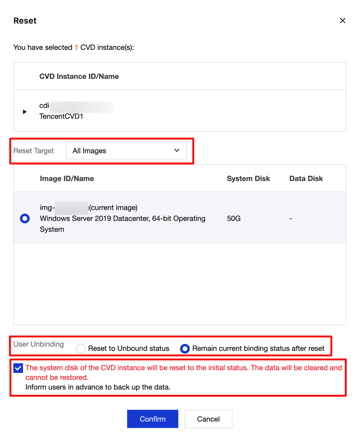 After a CVD instance is reset, the system disk of the instance will be restored to its initial status. Data will be cleared and cannot be recovered. Inform the user in advance to back up data.