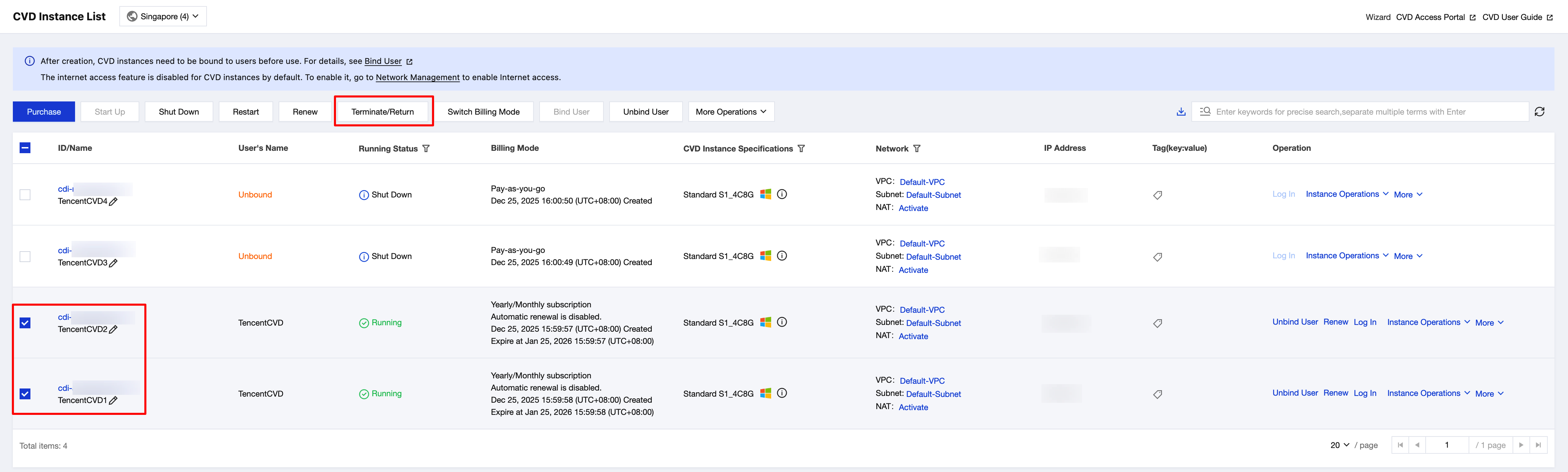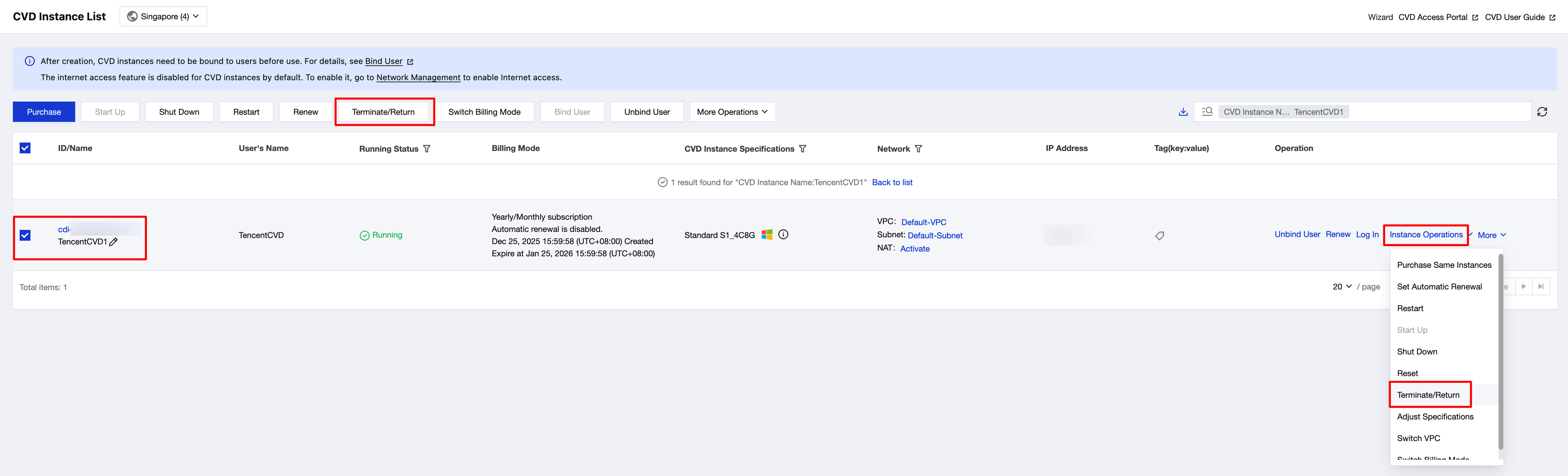 2. On the CVD Instance List page, select the CVD instance that you want to delete or refund, and then click Terminate/Return in the operation bar at the top or choose Instance Operations > Terminate/Return in the operation column on the right.
