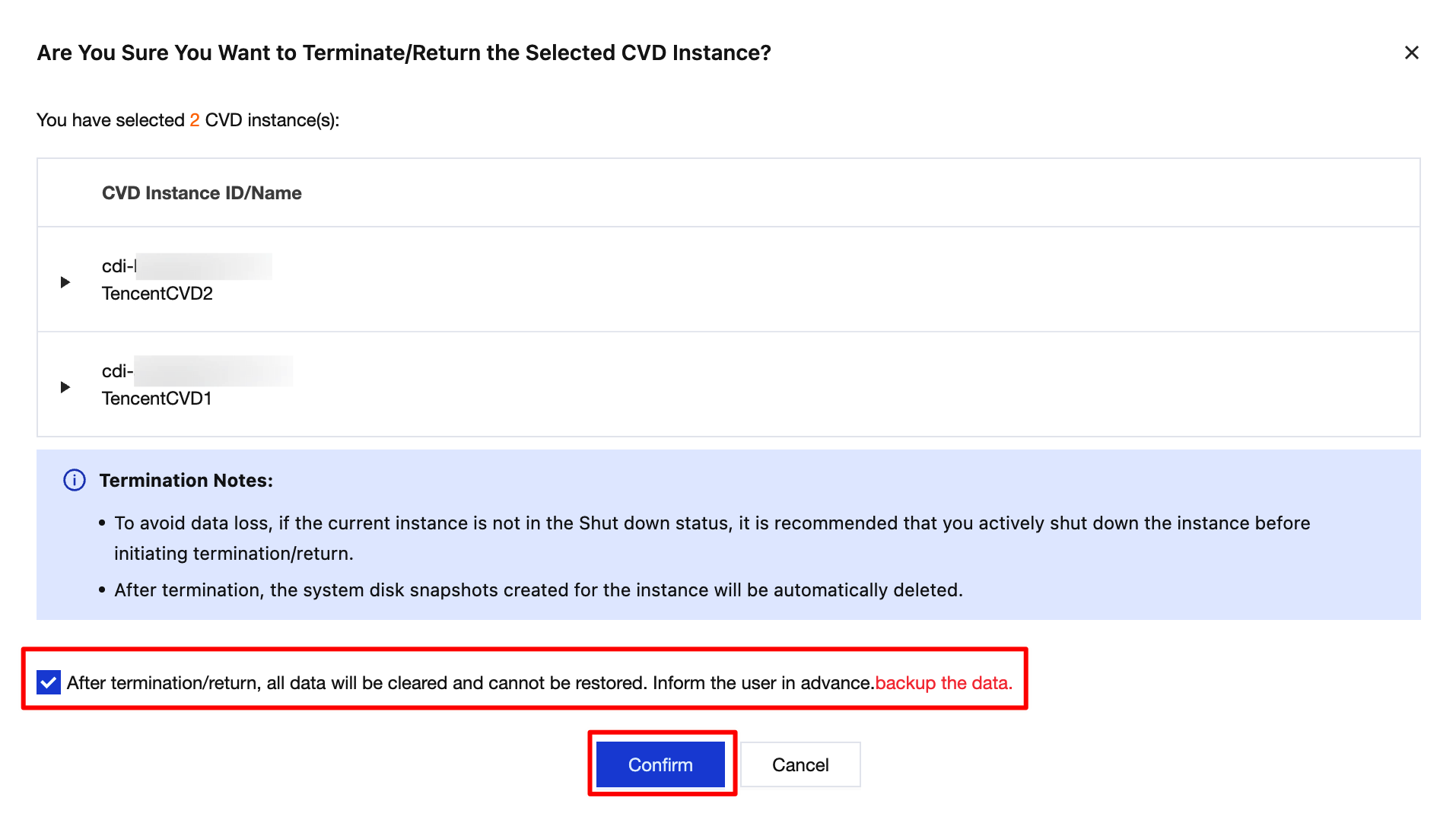 The deletion/refund processes for yearly/monthly subscription CVD instances and pay-as-you-go CVD instances are different. You cannot initiate deletion/refund for both types simultaneously. Perform the operations in separate batches.