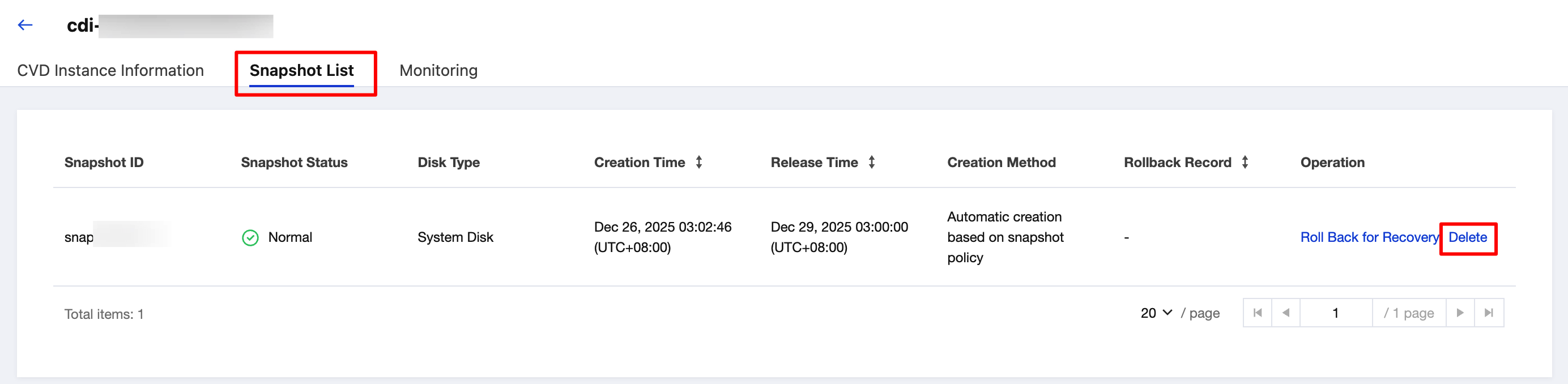 3. On the CVD instance details page, click the Snapshot List tab. Select the snapshot you want to delete and click Delete in the operation column on the right.