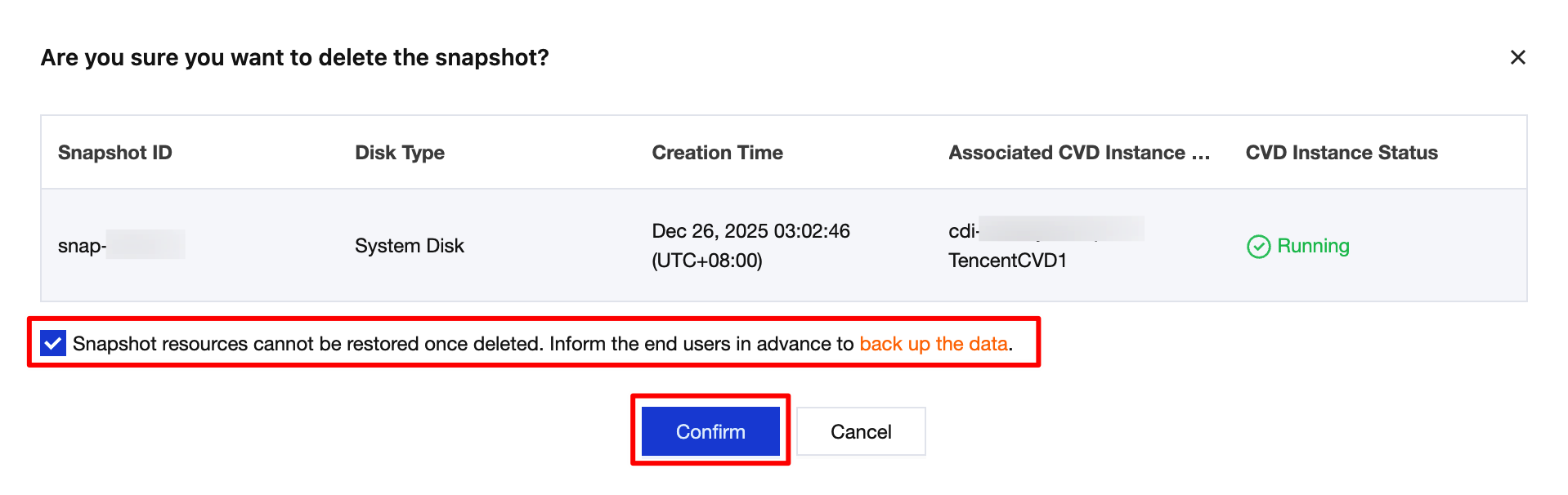 4. Deleted snapshots cannot be recovered. If you confirm the deletion, select the checkbox next to the warning "Snapshot resources cannot be restored once deleted. Inform the end user in advance to back up the data." and then click Confirm in the lower part.