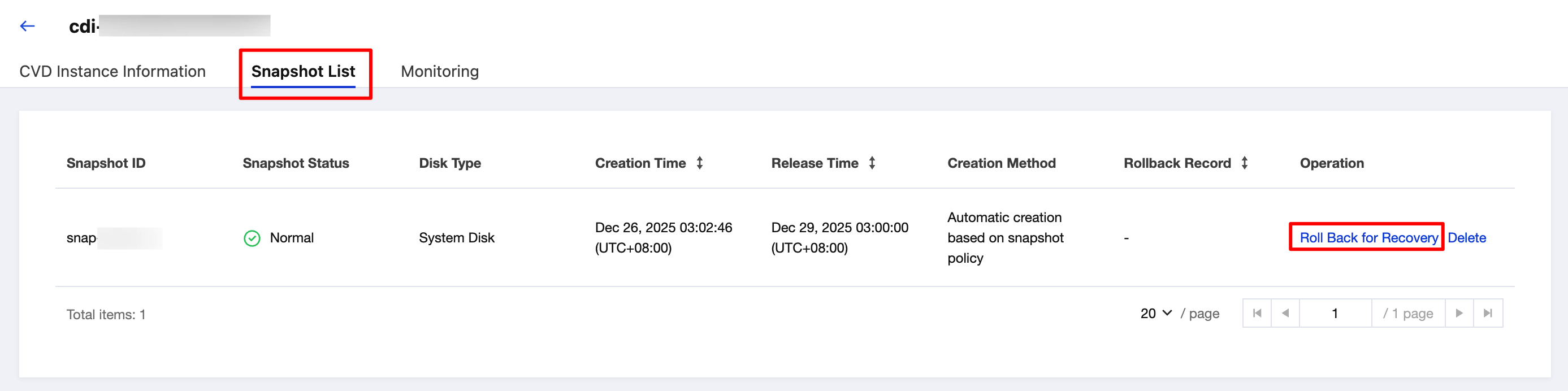 3. On the CVD instance details page, click the Snapshot List tab. Select the snapshot you want to roll back to and click Roll Back Recovery in the operation column on the right.