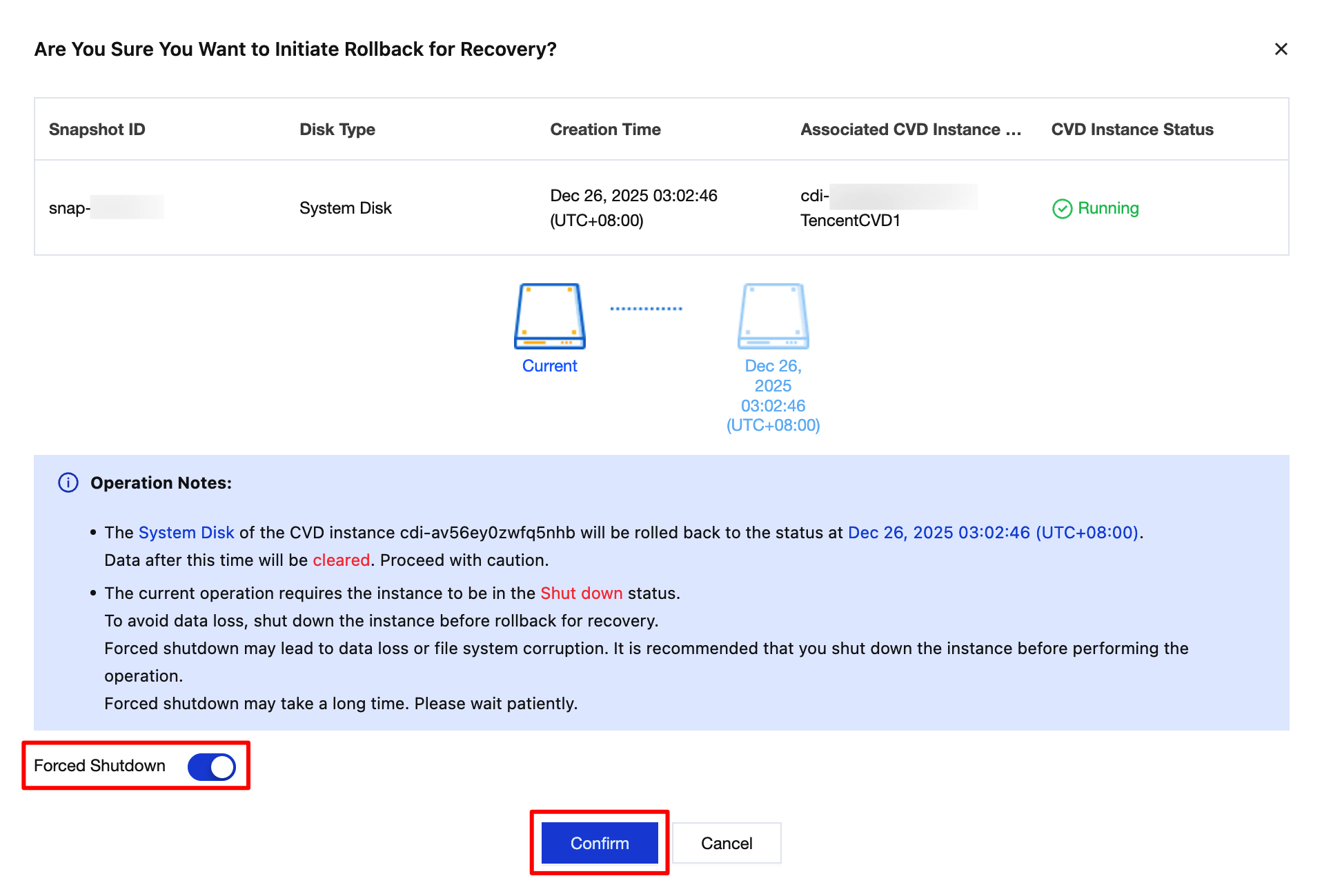 4. Confirm the rollback operation. The rollback operation will clear the current data on the CVD instance. Read the prompt for risk warning, enable the Forced Shutdown switch, and click Confirm in the lower part.