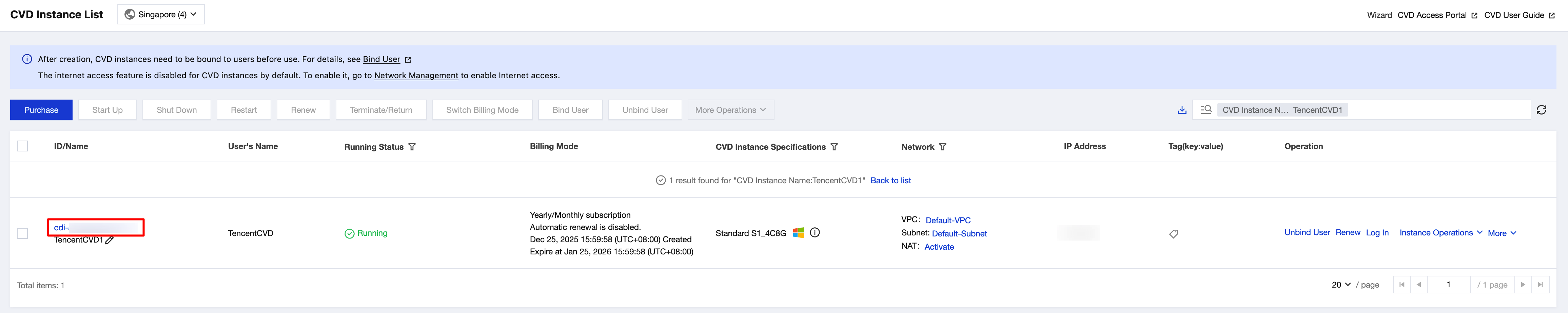 2. On the CVD Instance List page, select the CVD instance for which you need to roll back a snapshot, and click the CVD instance ID on the left to go to the CVD instance details page.