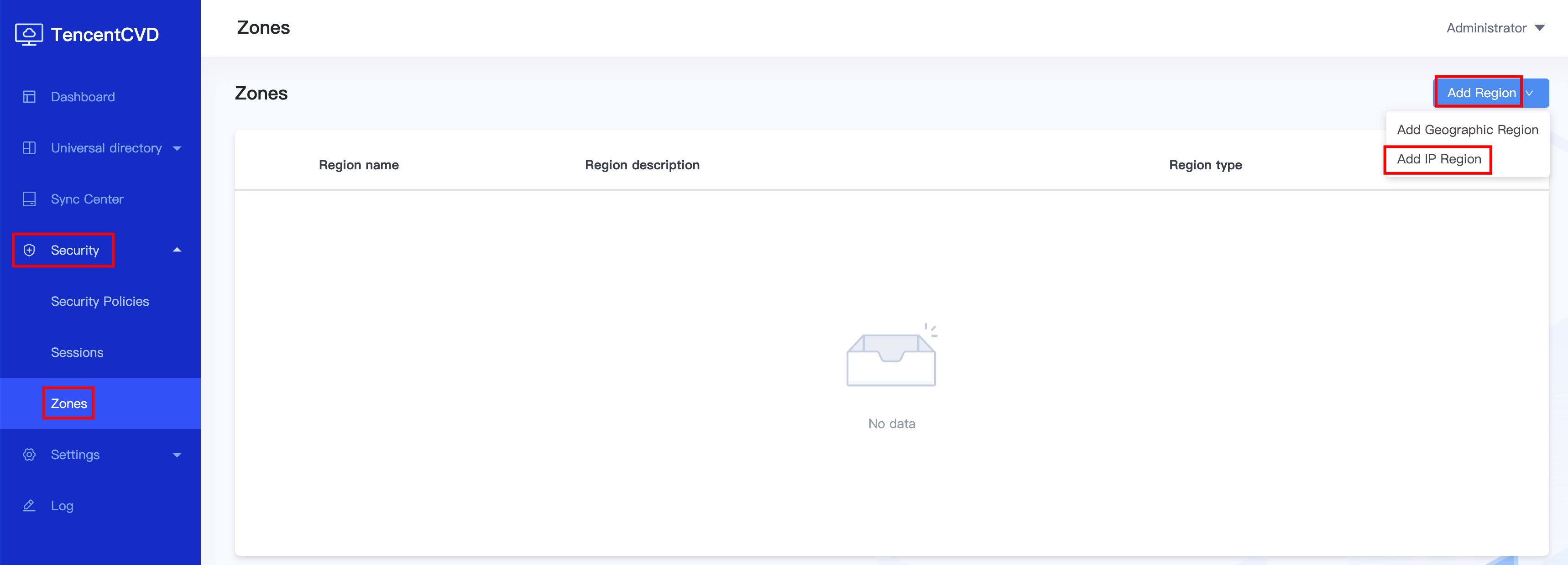 3. Choose Security > Zones, and then choose Add Region > Add IP Region.