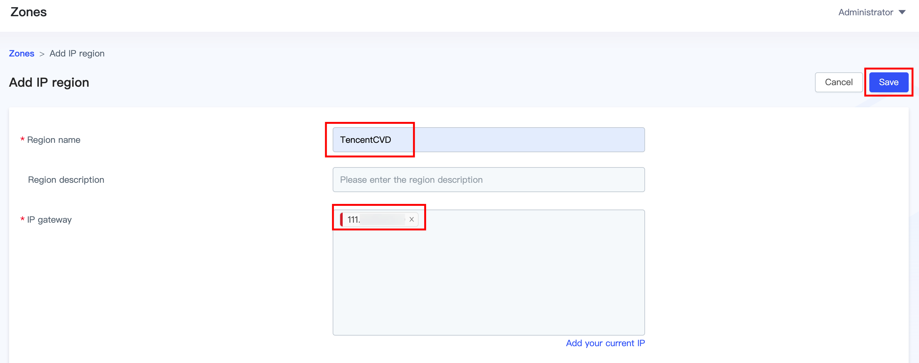 4. Enter a region name and description. In the IP Gateway field, enter the public IP addresses to be restricted. To restrict multiple public IP addresses, enter them all. After you complete the operation, click Save.