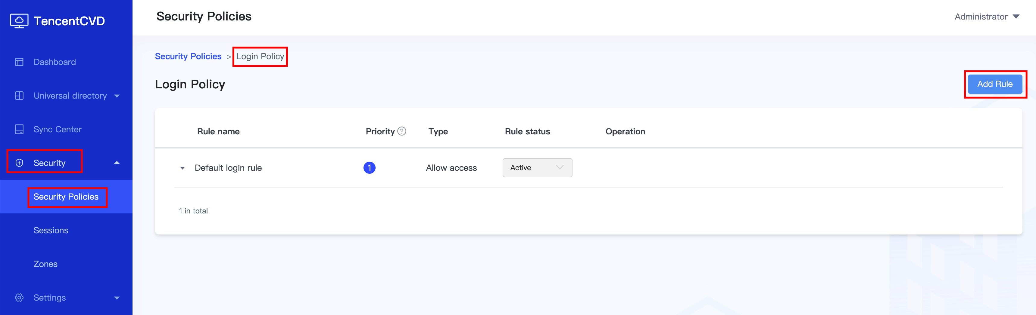 5. Choose Security > Security Policies, click Login Policy to go to the page, and then click Add Rule.