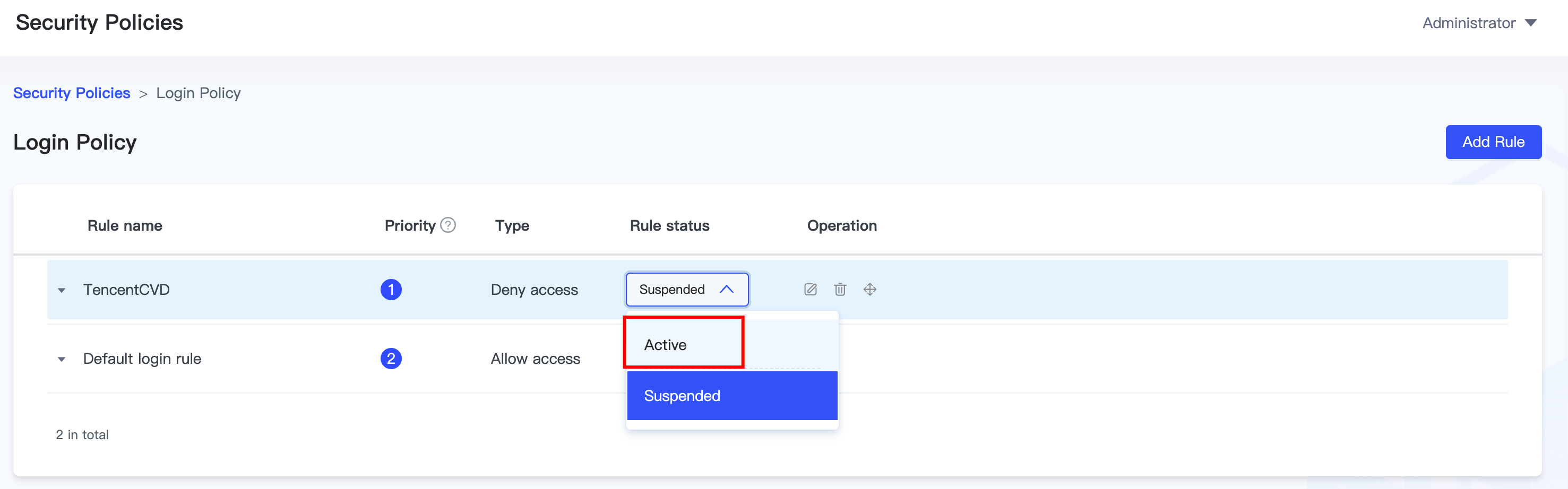 7. After the login rule is added, the rule status is set to Disabled by default. You need to switch it to Enabled to enable the login policy.