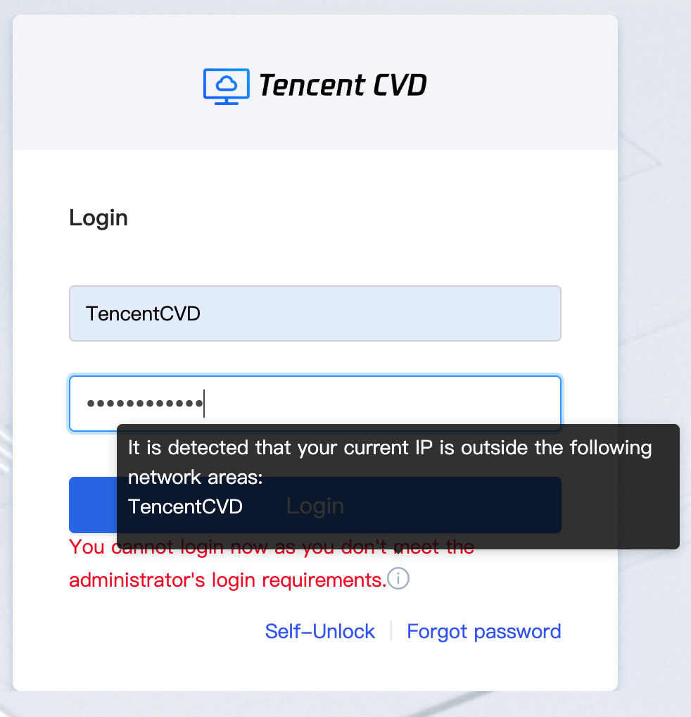 When logging in to the CVD portal from outside the defined IP region, the prompt "You cannot login now as you don't meet the administrator's login requirements" appears, denying the login attempt.