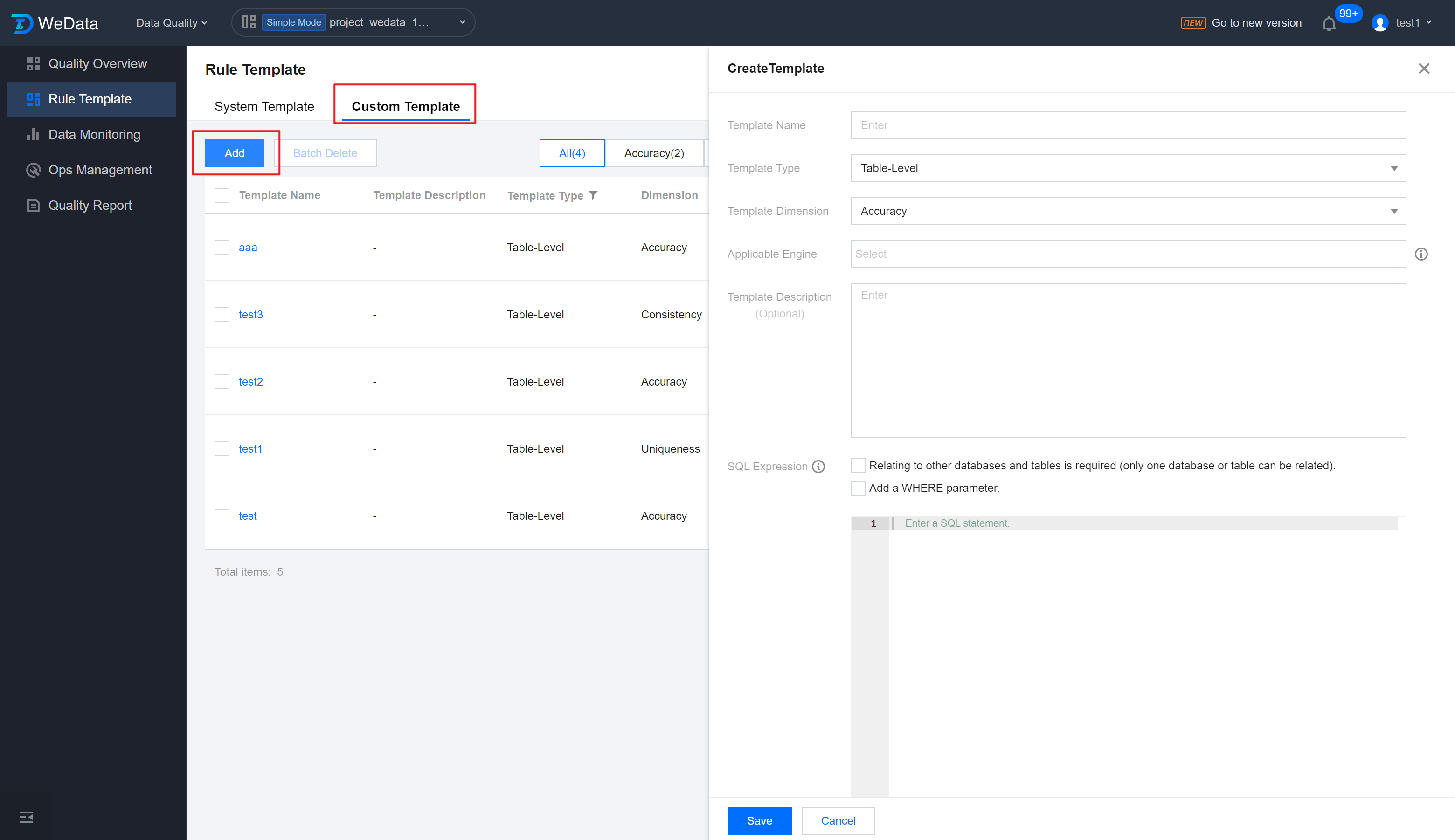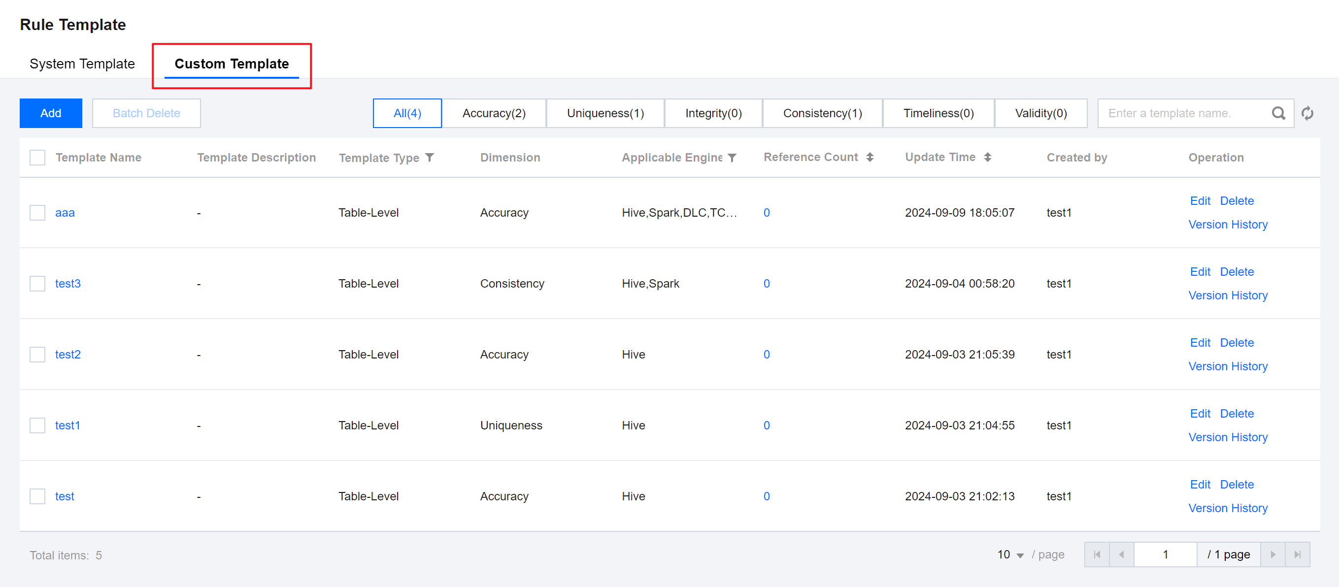 Template Dimension | Six dimensions: Accuracy, Uniqueness, Integrity, Consistency, Timeliness, Validity |