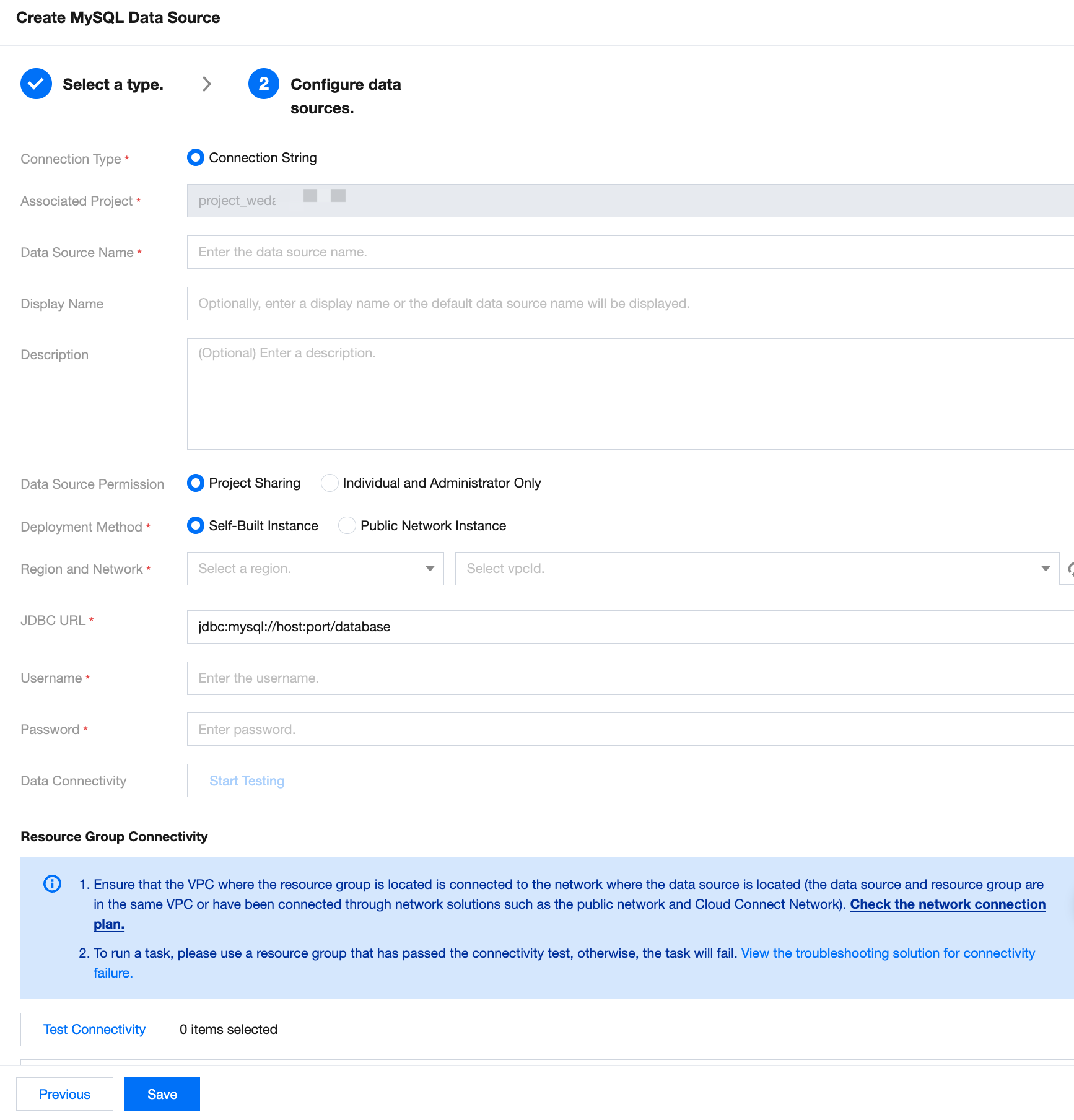 Region and Network | When selecting a self-built instance, you need to select the region and vpcID where the data source instance is located. |