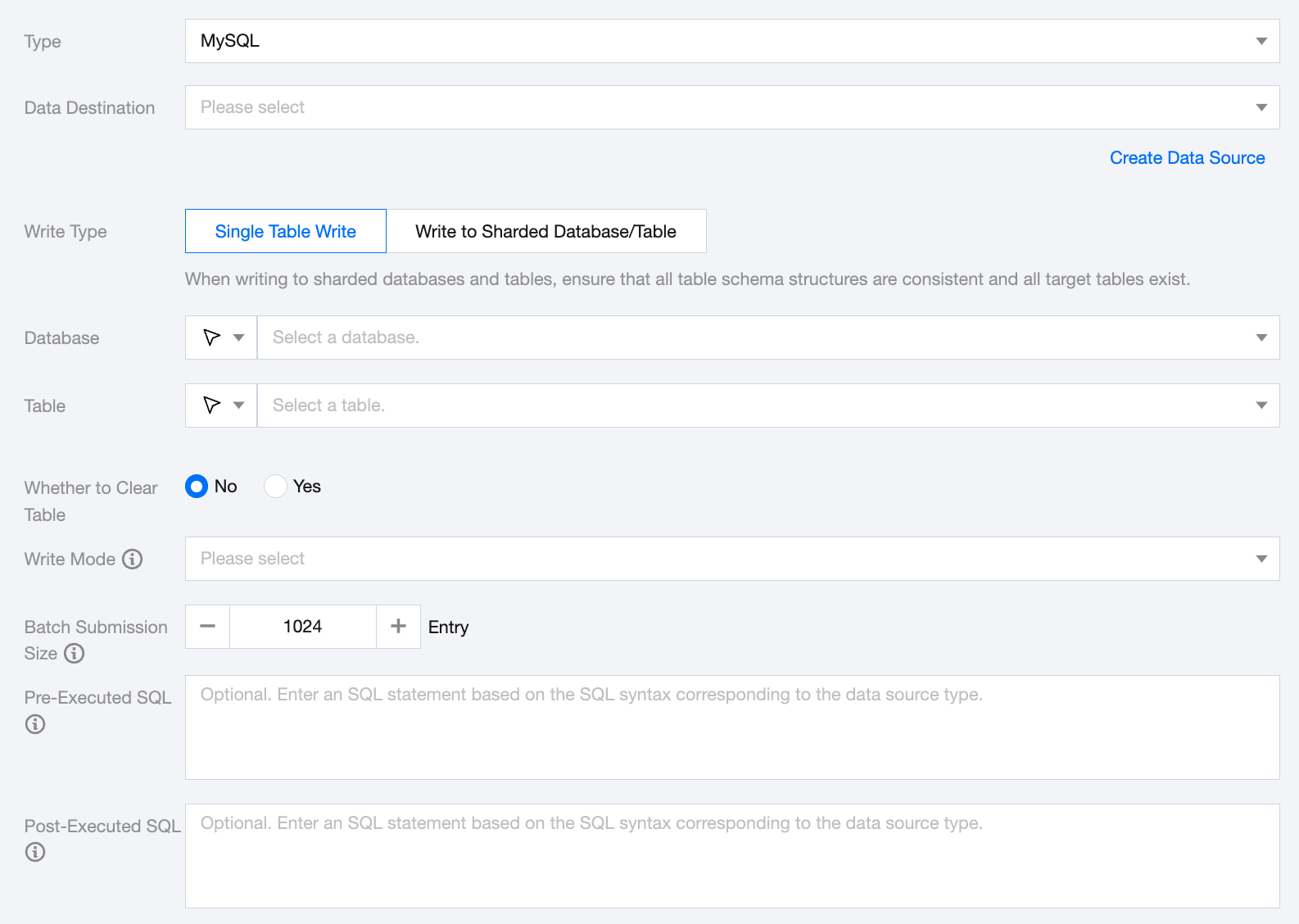 Write Type | Single table write: Supports single table writing Write to Sharded Databases/Tables: Supports one-time writing to sharded MySQL tables within the same data source. Ensure all table schema structures are consistent and all target tables exist. |